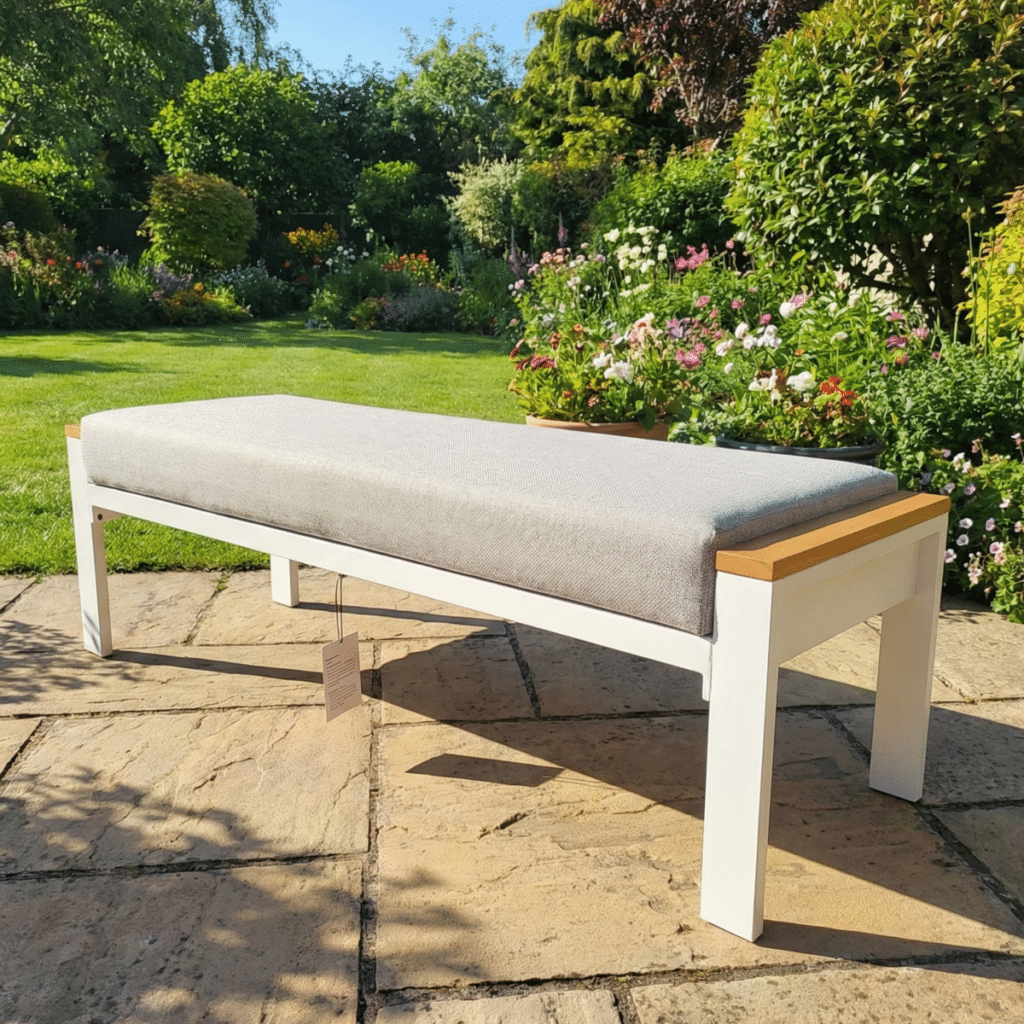Das dicke Sitzkissen von ganzen 12 cm sorgt für hervorragenden Sitzkomfort. Der graue Polyesterbezug passt perfekt zum mattweißen Gestell und dem warmen Holz. Mit einer Sitzhöhe von 42 cm und einer Sitztiefe von 40 cm sitzt du entspannt und kannst sommerliche Momente im Freien richtig genießen. Das pulverbeschichtete Aluminiumgestell ist leicht, rostfrei und kann das ganze Jahr über draußen stehen bleiben. Ein feuchtes Tuch mit etwas Seifenwasser reicht aus, um die Bank sauber zu halten.