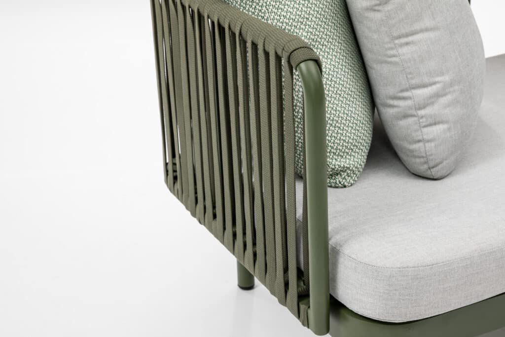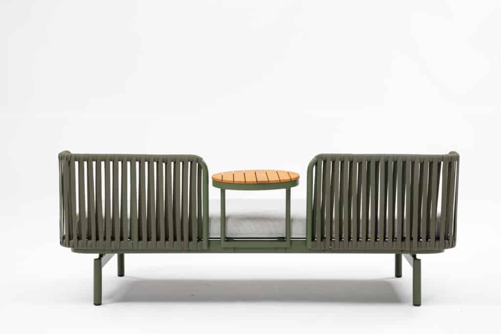 Das 10 cm dicke Sitzkissen sorgt für hervorragenden Sitzkomfort bei einer Sitzhöhe von 41 cm. Die vier mitgelieferten Rückenkissen (2x 50 x 50 cm und 2x 40 x 40 cm) bieten zusätzliche Unterstützung. Die Rückenlehnen sind mit wunderschönem gewebtem Rope von etwa 2 cm Breite versehen, was für einen luxuriösen Look sorgt. Sowohl die Rückenlehnen als auch das Tischchen können überall rund um das Gestell platziert werden. Dadurch ist es eine multifunktionale Bank, die du ganz nach Wunsch zusammenstellen kannst. Das praktische Tischchen mit einem Durchmesser von 40 cm ist perfekt für dein Getränk oder ein Buch.