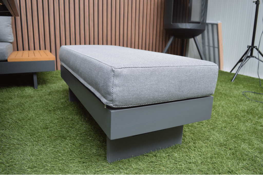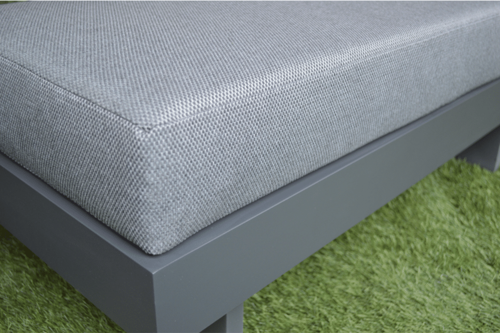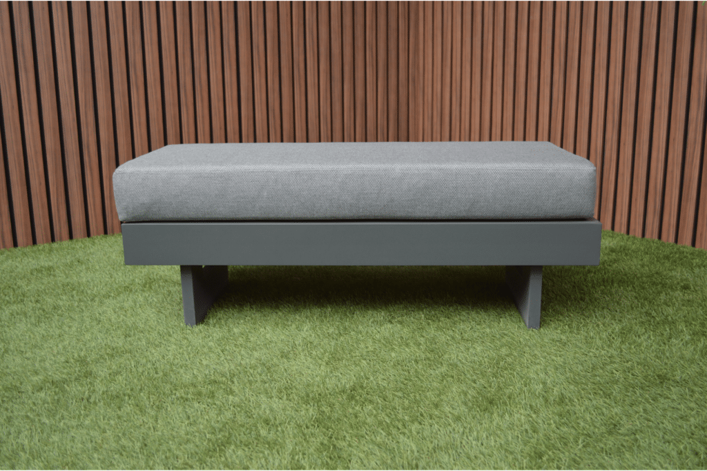 Das Gestell ist anthrazit pulverbeschichtet und aus massivem, hochwertigem Aluminium gefertigt. Dadurch kann die Bank das ganze Jahr über draußen stehen bleiben – ohne zu rosten oder zu verfärben. Das Aluminium ist wartungsfrei; ein einfaches Abwischen mit Seifenwasser genügt, um es in Top-Zustand zu halten.