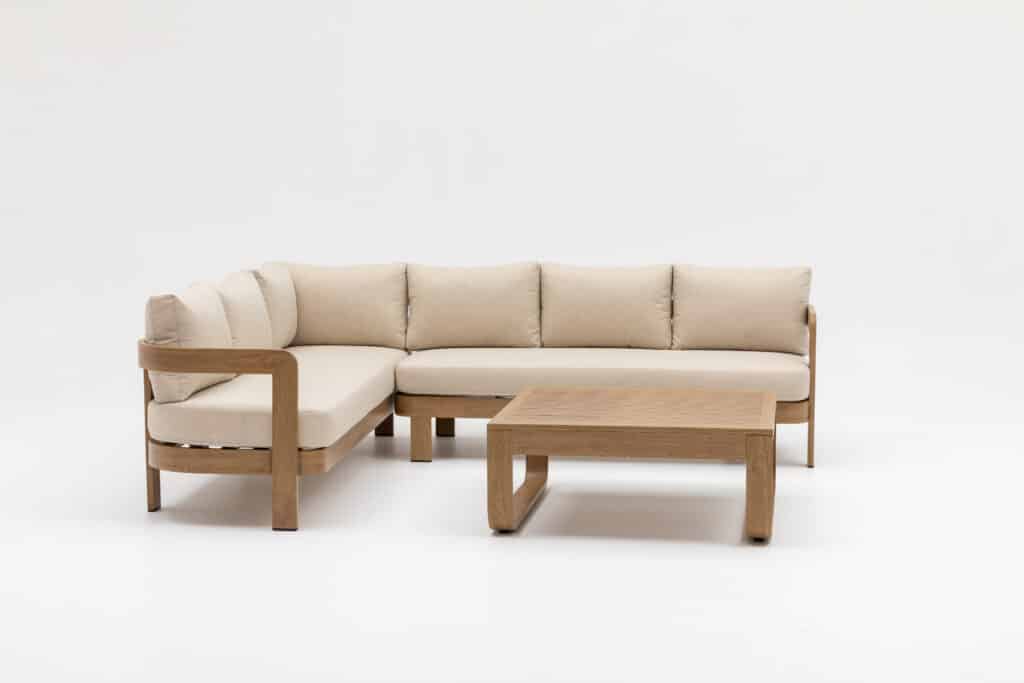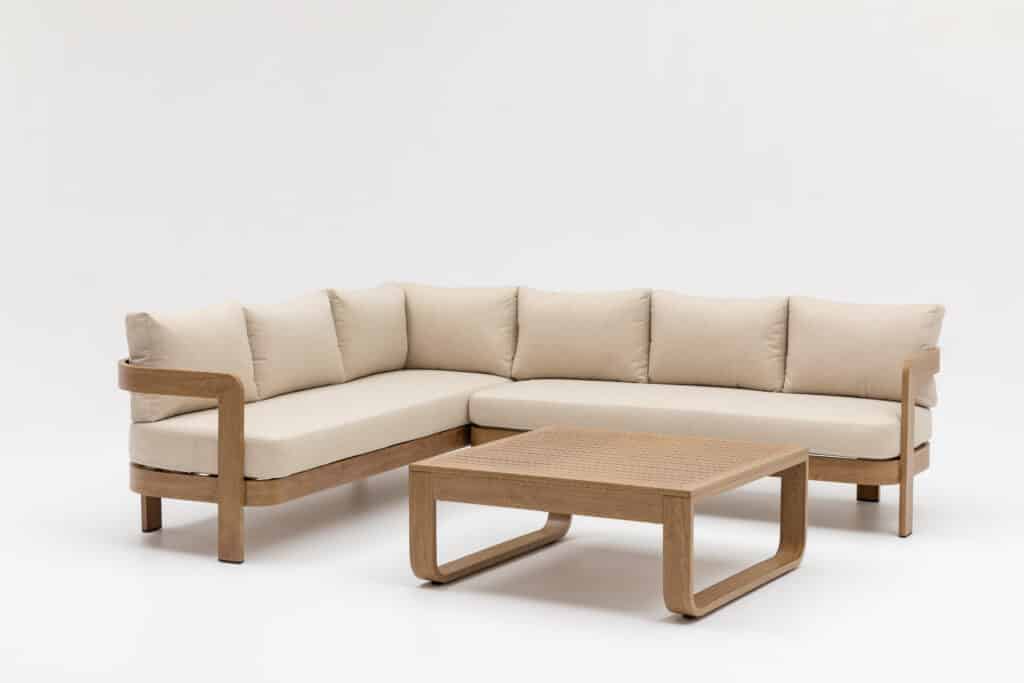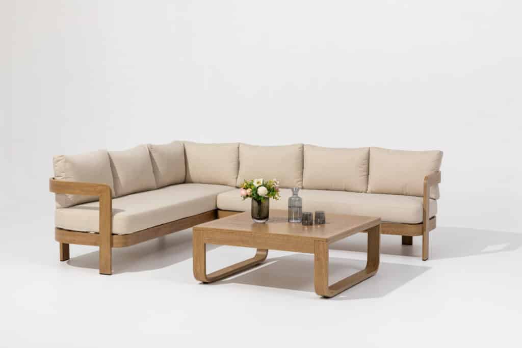Das Gestell besteht aus pulverbeschichtetem Aluminium in warmer natürlicher Holzoptik. Dieses Material ist leicht, rostfrei und widerstandsfähig gegen alle Witterungseinflüsse. Die Kissen sind mit einem warmweißen All-Weather-Polyesterstoff bezogen. Regen oder starke Sonneneinstrahlung? Kein Problem. So kannst du deine entspannten Outdoor-Momente ganz sorgenfrei genießen. Dieses komplette Set aus der beliebten Santiago-Serie bietet bequem Platz für 5 bis 6 Personen. Das moderne Design mit der warmen Holzoptik macht dieses Gartenlounge zu einem echten Blickfang auf deiner Terrasse.