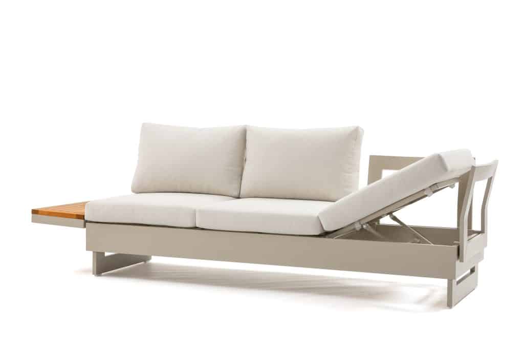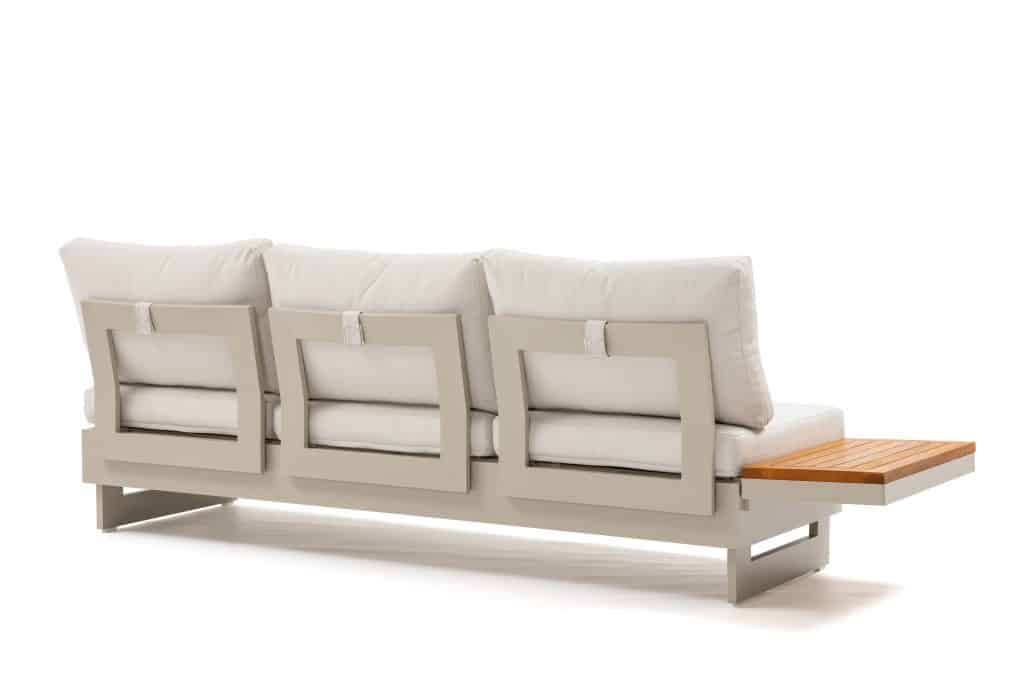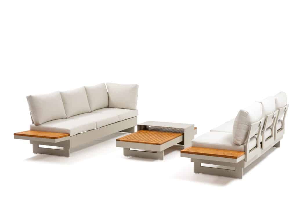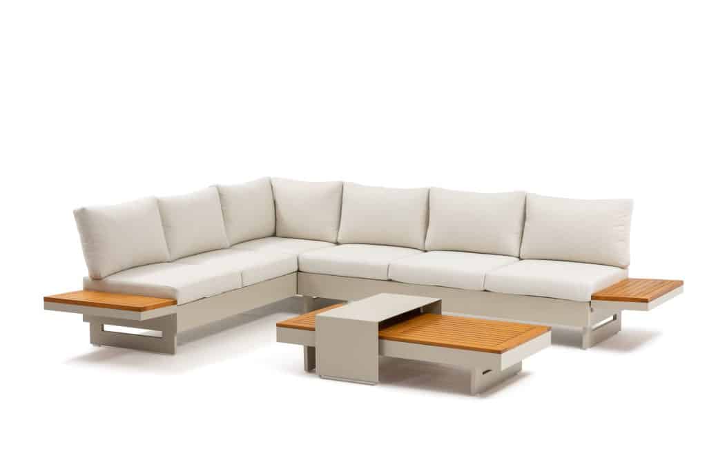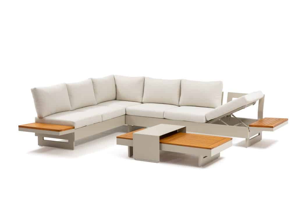 Die Rückenlehnen und Holzablagen lassen sich rundum an den Bänken positionieren. Dadurch können Sie verschiedene Aufstellungen gestalten, wie z. B. ein Ecksofa, zwei separate Bänke oder eine komfortable Liegefläche. Die äußeren Sitzplätze sind höhenverstellbar – ideal, um entspannt mit einem Buch zu liegen. Die extra dicken Sitzkissen mit einer Stärke von ganzen 12 cm sind vollständig wasserabweisend und bestehen aus einem komfortablen Olefin All-Weather-Stoff. Mit einer Sitzhöhe von 42 cm sitzen Sie besonders angenehm und entspannt. Die Kissen sind abziehbar und waschbar, was die Pflege sehr einfach macht. Das Set ist vergleichbar mit dem beliebten Barbados Beige Gartenlounge und wird seit Jahren äußerst erfolgreich verkauft.