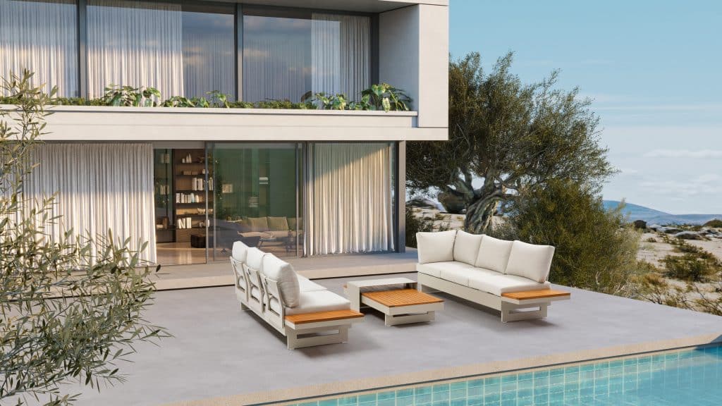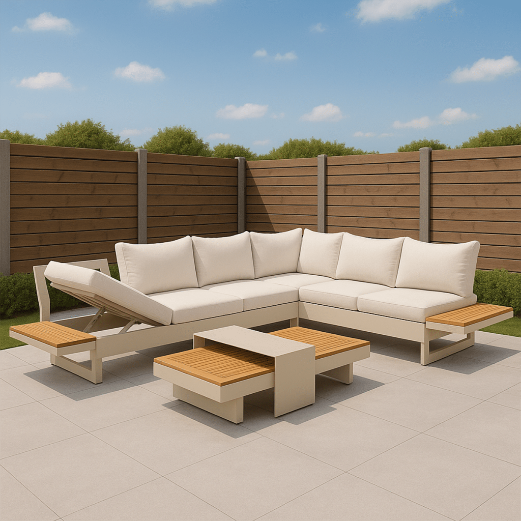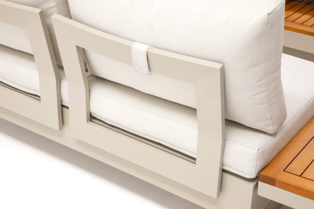 Das Gestell besteht aus hochwertigem pulverbeschichtetem Aluminium: leicht, rostfrei und pflegeleicht. Die warmen Akzente aus FSC-zertifiziertem Akazien-Hartholz sorgen für eine elegante und natürliche Ausstrahlung. Die Farbe des Gestells ist zu 100 % identisch mit allen anderen Gartenmöbeln auf unserer Website in Warmweiß. Dadurch lässt sich dieses Loungeset mühelos mit passenden Tischen, Stühlen und Sesseln kombinieren. Bereit, Ihren Garten zu verwandeln? Bestellen Sie jetzt das Gartenlounge Premium Emerald II Warmweiß Ecksofa und genießen Sie maximalen Komfort.