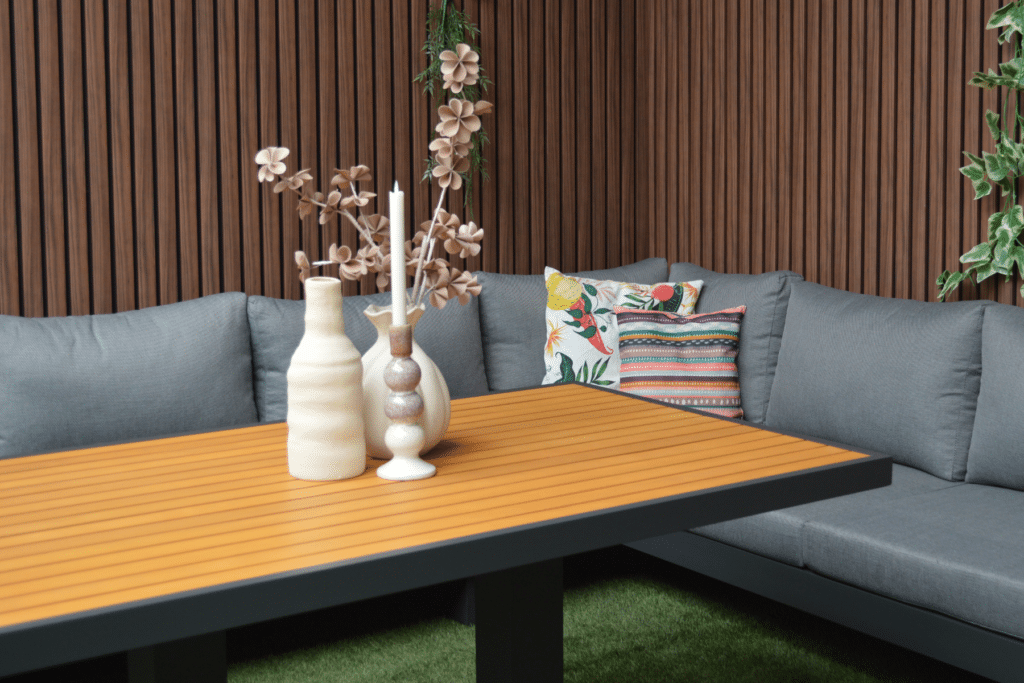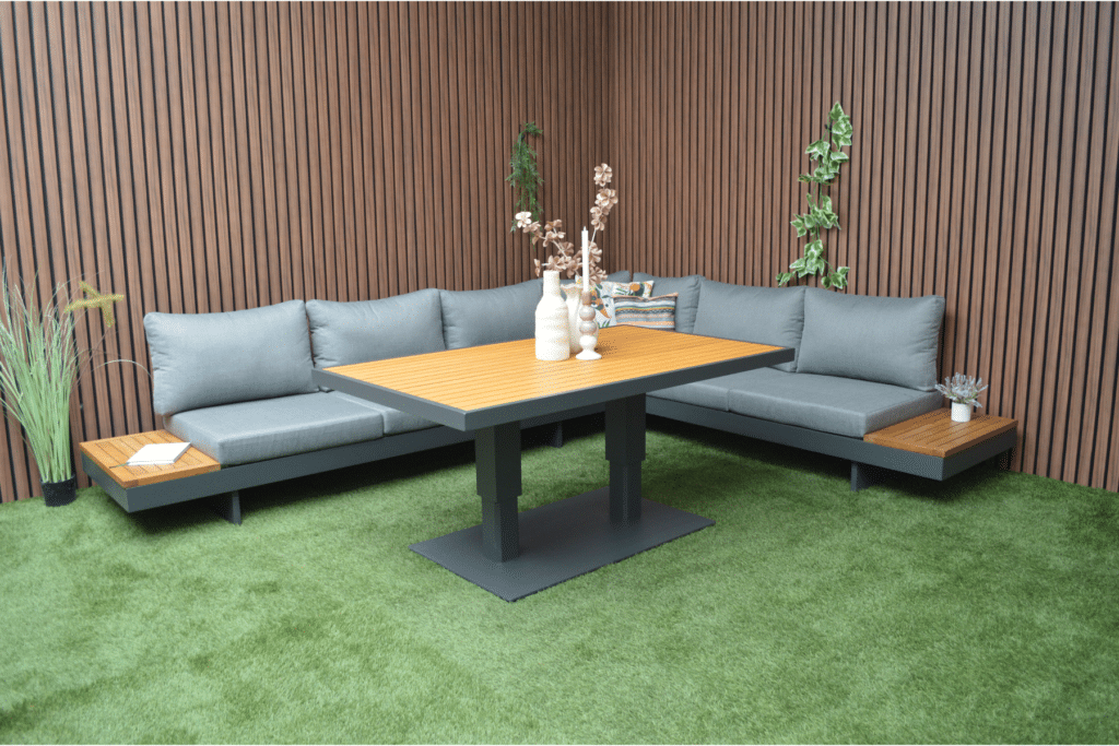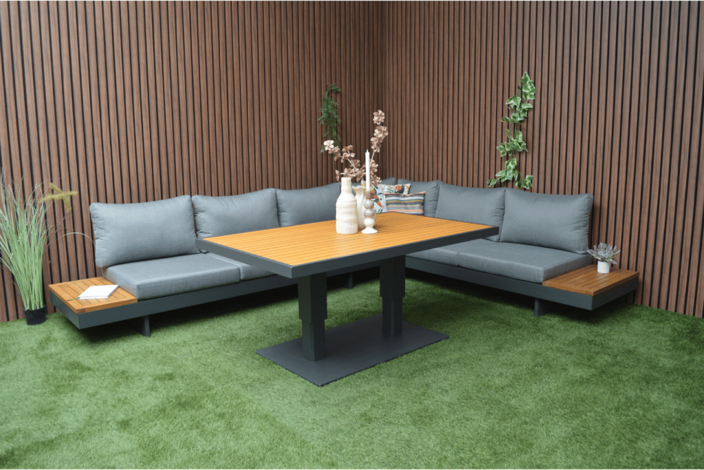 Suchst du ein luxuriöses Ecksofa für die ganze Familie? Die Gartenlounge Monte Carlo Ecksofa mit verstellbarem Tisch, Gartenmöbelset für 6 Personen aus Aluminium/Holz wurde für alle entworfen, die ihren Außenbereich in einen stilvollen und komfortablen Lebensraum verwandeln möchten. Dieses großzügige 4-teilige Set bietet Platz für sechs Personen und verfügt über die gleiche geräumige Aufstellung wie die beliebten Varianten, zeichnet sich jedoch durch den praktischen, höhenverstellbaren Tisch aus.
