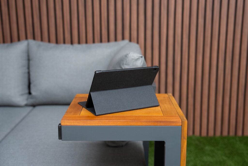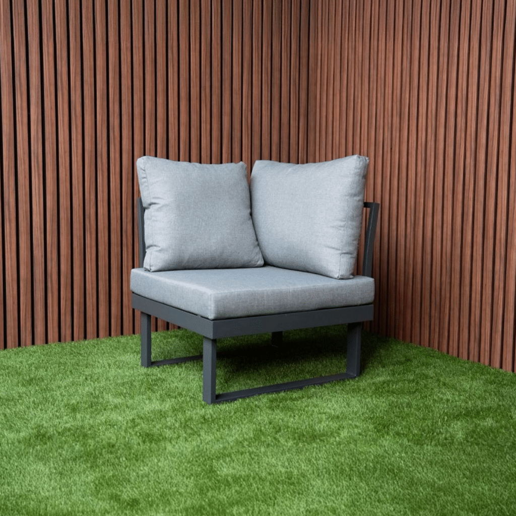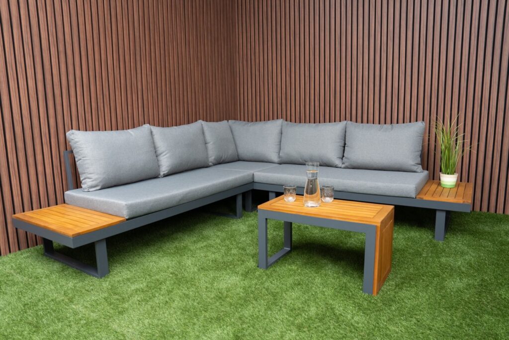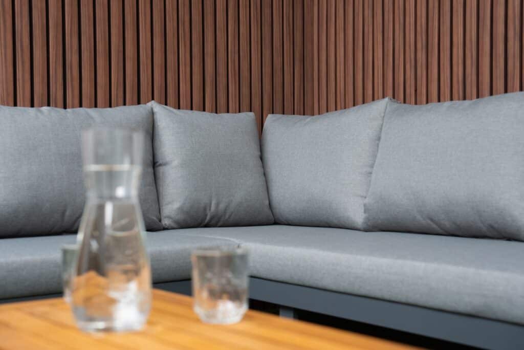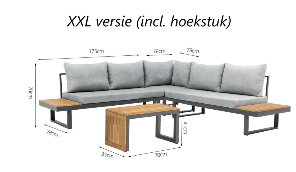 Das pulverbeschichtete Aluminiumgestell in Anthrazit ist leicht, rostfrei und pflegeleicht. Akzente aus FSC-zertifiziertem Akazien-Hartholz verleihen dem Set eine warme und natürliche Ausstrahlung. Die Farbe des Gestells ist zu 100 % identisch mit allen anderen Gartenmöbeln auf unserer Website in Anthrazit. Möchten Sie noch mehr Platz? Bestellen Sie optional ein zusätzliches Eckmodul und vergrößern Sie Ihr Ecksofa von 175 × 253 cm auf eine großzügige Eckaufstellung von 253 × 253 cm. Außerdem sind eine passende Regenabdeckung sowie ein zusätzlicher Lounge-Sessel erhältlich. Weitere Informationen finden Sie in den letzten Produktfotos. Bereit, Ihren Außenbereich zu verwandeln? Bestellen Sie jetzt das Gartenlounge SenS-Line Olympia Verstellbares Ecksofa und genießen Sie maximale Vielseitigkeit.