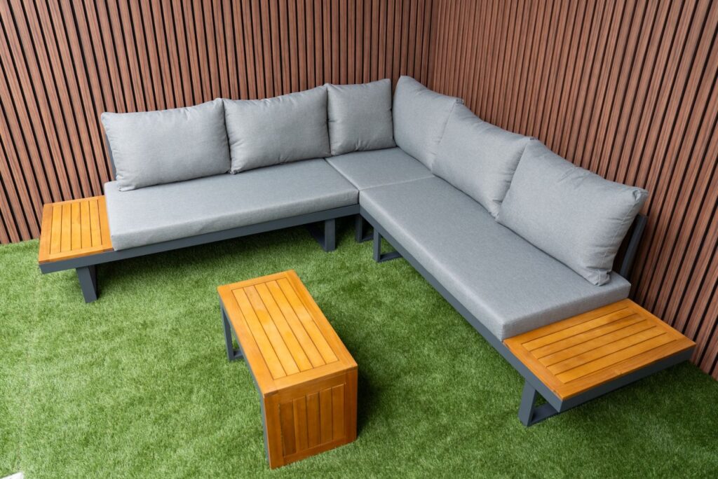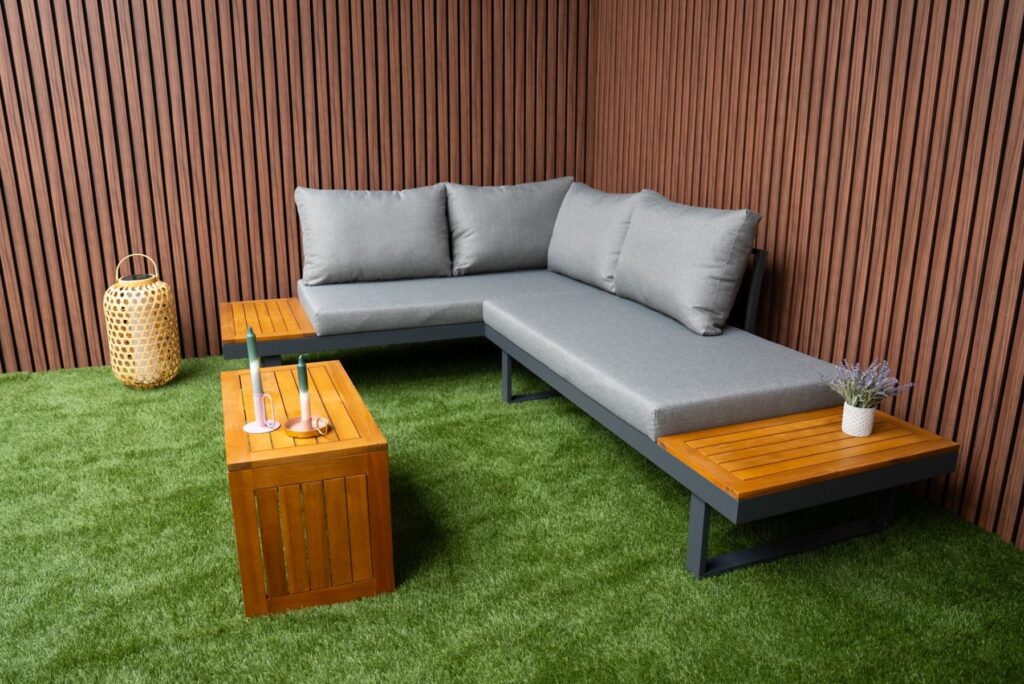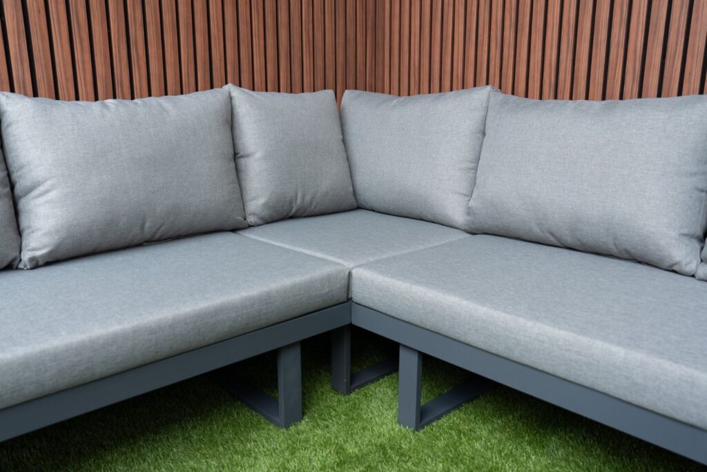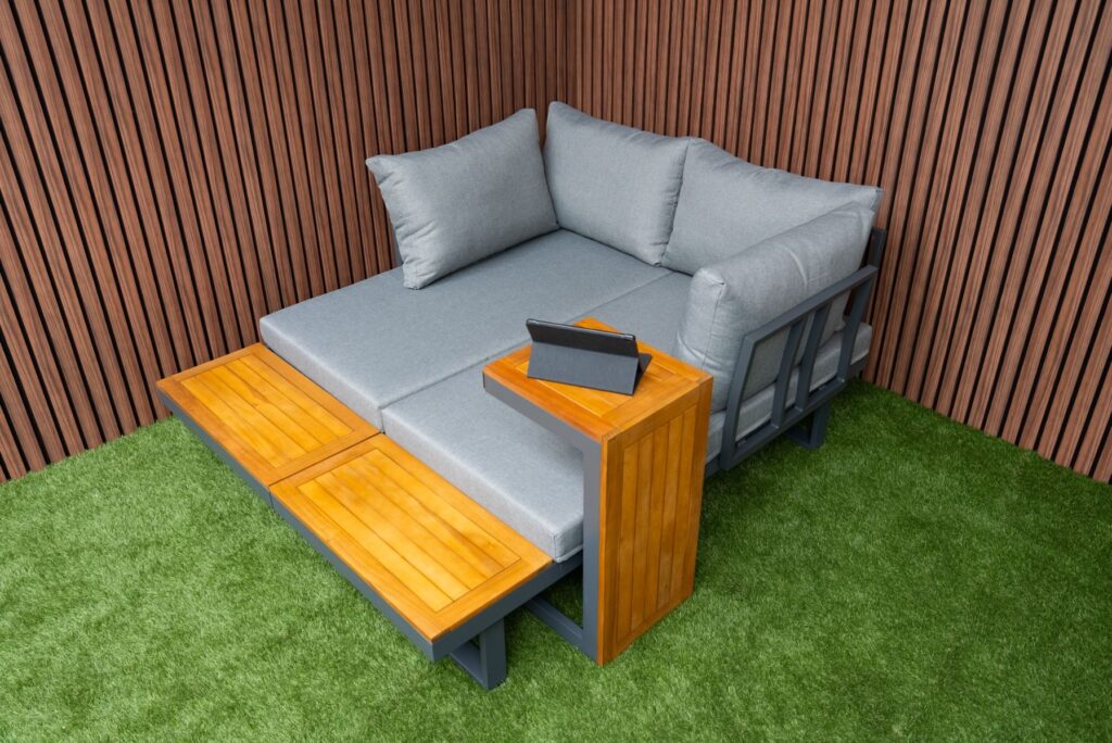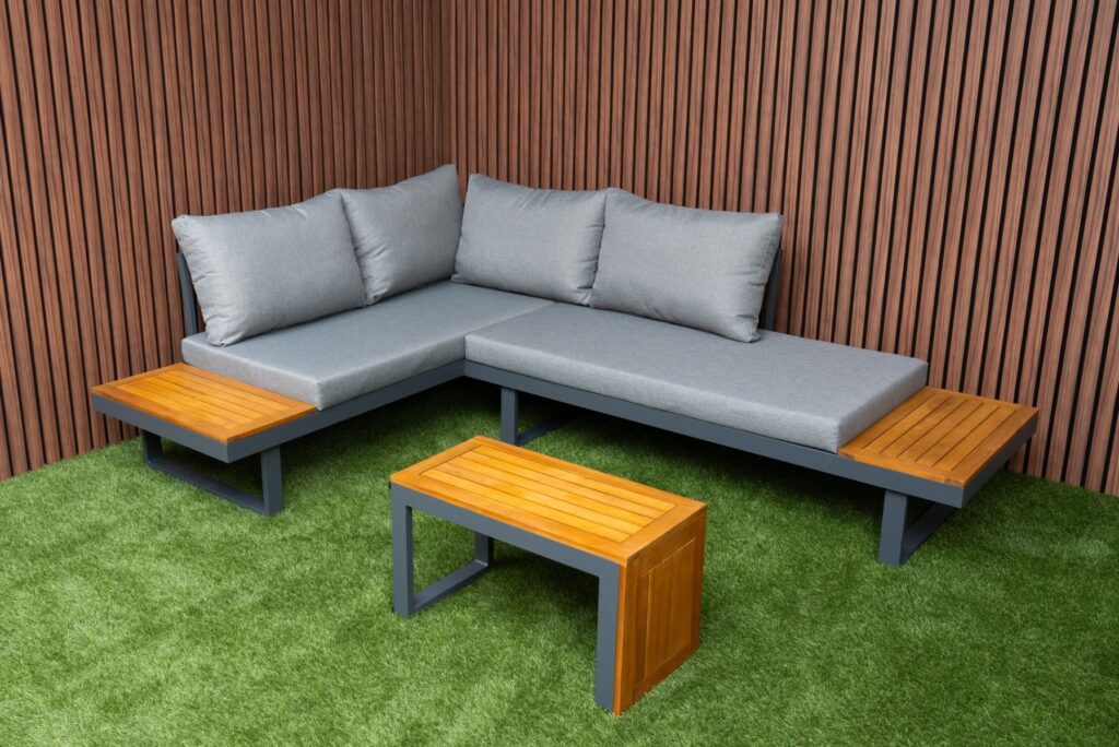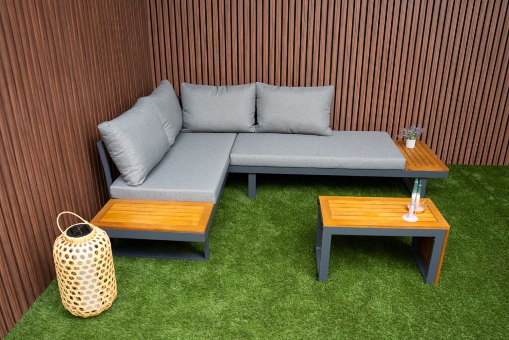 Das pulverbeschichtete Aluminiumgestell in Anthrazit ist leicht, rostfrei und pflegeleicht. Akzente aus FSC-zertifiziertem Akazien-Hartholz verleihen dem Set eine warme und natürliche Ausstrahlung. Die Farbe des Gestells ist zu 100 % identisch mit allen anderen Gartenmöbeln auf unserer Website in Anthrazit. Möchten Sie noch mehr Platz? Bestellen Sie optional ein zusätzliches Eckmodul und vergrößern Sie Ihr Ecksofa von 175 × 253 cm auf eine großzügige Eckaufstellung von 253 × 253 cm. Außerdem sind eine passende Regenabdeckung sowie ein zusätzlicher Lounge-Sessel erhältlich. Weitere Informationen finden Sie in den letzten Produktfotos. Bereit, Ihren Außenbereich zu verwandeln? Bestellen Sie jetzt das Gartenlounge SenS-Line Olympia Verstellbares Ecksofa und genießen Sie maximale Vielseitigkeit.