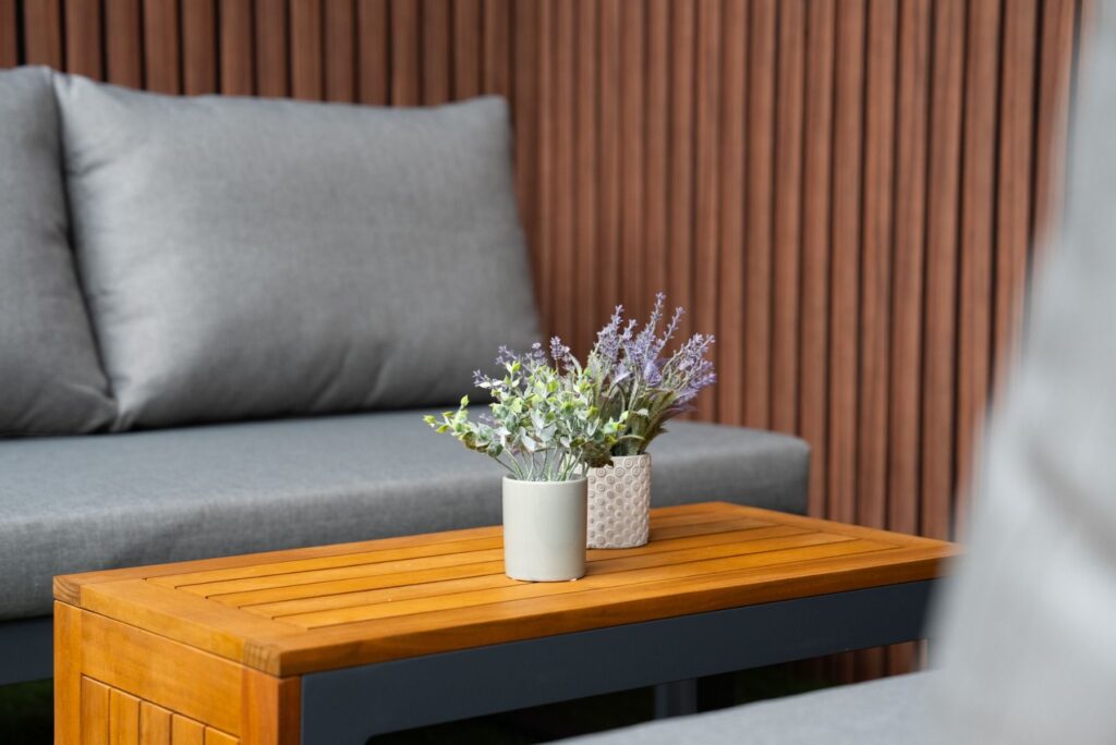 Die Rückenlehnen lassen sich rundum an den Bänken positionieren. Dadurch entstehen verschiedene Aufstellungen, wie z. B. ein Ecksofa, zwei separate Sitzplätze oder sogar eine komfortable Liegefläche. Im Handumdrehen passen Sie das Set an die jeweilige Situation des Tages an. Auch der Couchtisch ist auf zwei Arten nutzbar: liegend oder stehend – ganz nach Ihren Wünschen. Die dicken Sitzkissen mit einer Stärke von 10 cm bestehen aus wasserabweisendem Polyester und sorgen sofort für hohen Sitzkomfort. Mit einer Sitzhöhe von 42 cm sitzen Sie angenehm entspannt – ideal zum Relaxen oder für gesellige Gespräche.
