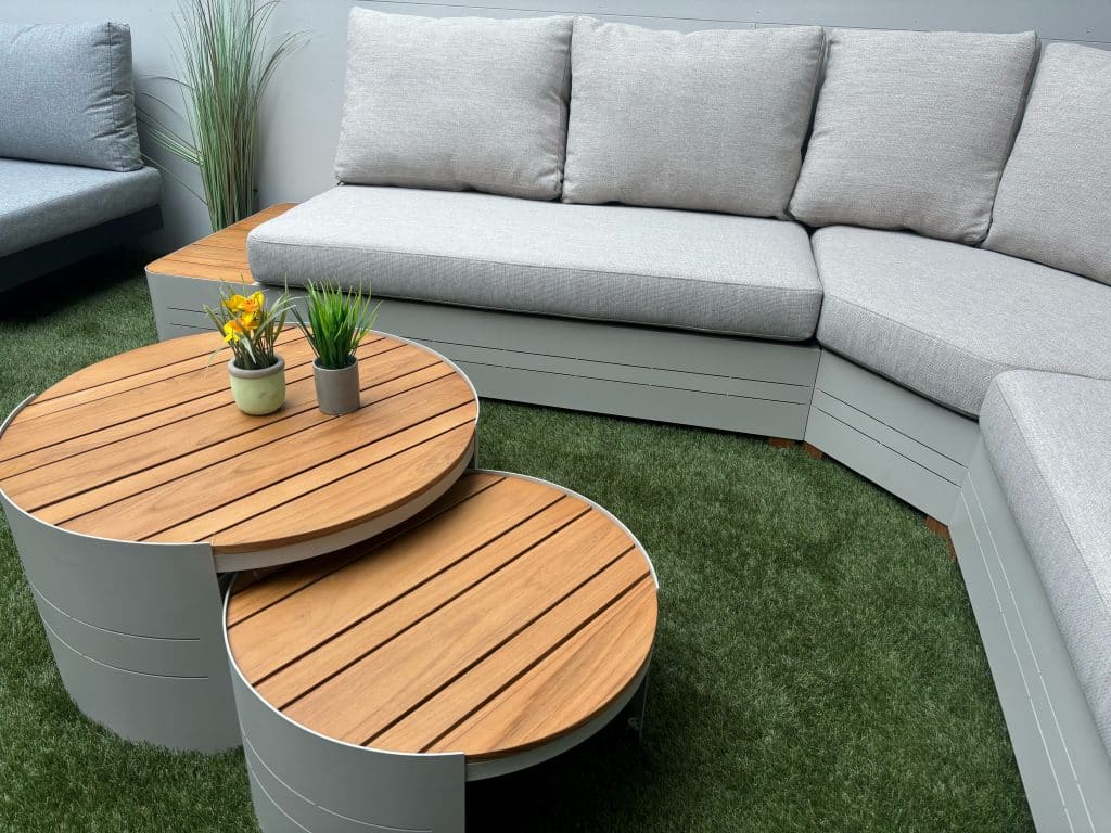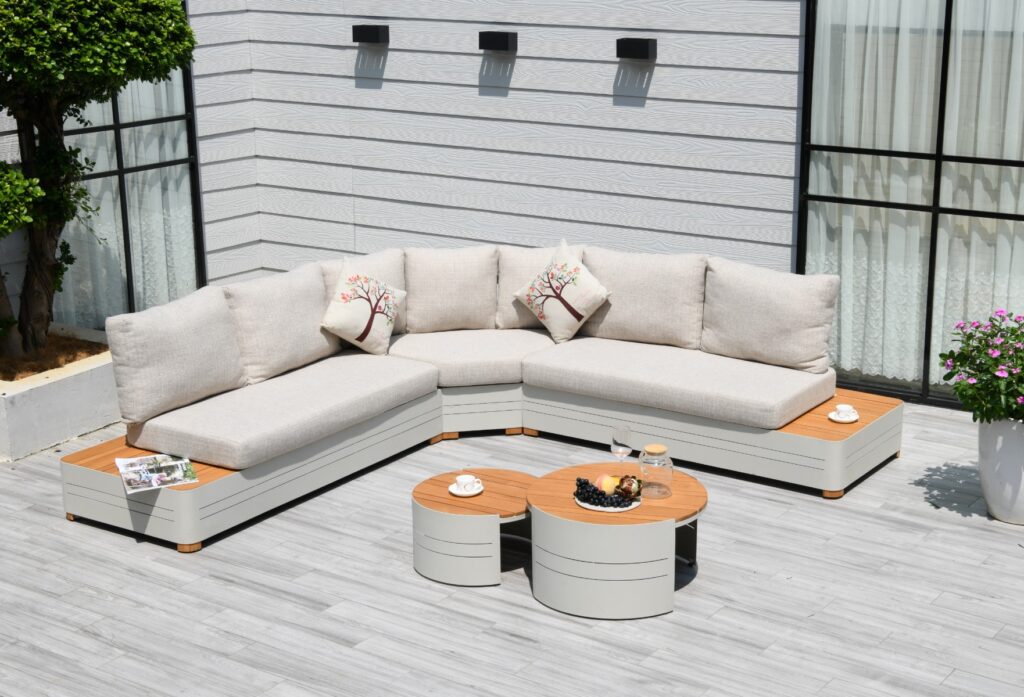 Das Gartenlounge Zanzibar Premium Weiß Gartenmöbelset Ecksofa 6-Sitzer Aluminium/Holz R24S03C verwandelt Ihre Terrasse in eine moderne Relax-Oase. Dieses besonders großzügige 5-teilige Set besteht aus zwei wunderschönen Bänken mit den Maßen 170 × 77 × 66 cm, einem großen Eckelement mit 150 × 77 × 66 cm, einem großen Couchtisch mit 70 × 70 × 38 cm sowie einem kleinen Couchtisch mit 55 × 55 × 30 cm. Zusammen bieten sie komfortabel Platz für bis zu sechs Personen – perfekt für entspannte Sommermomente mit Familie und Freunden.