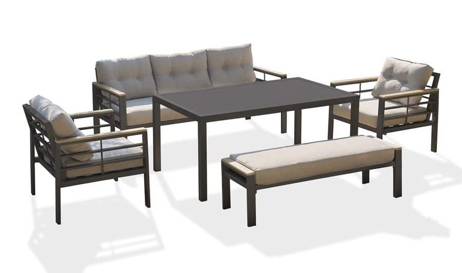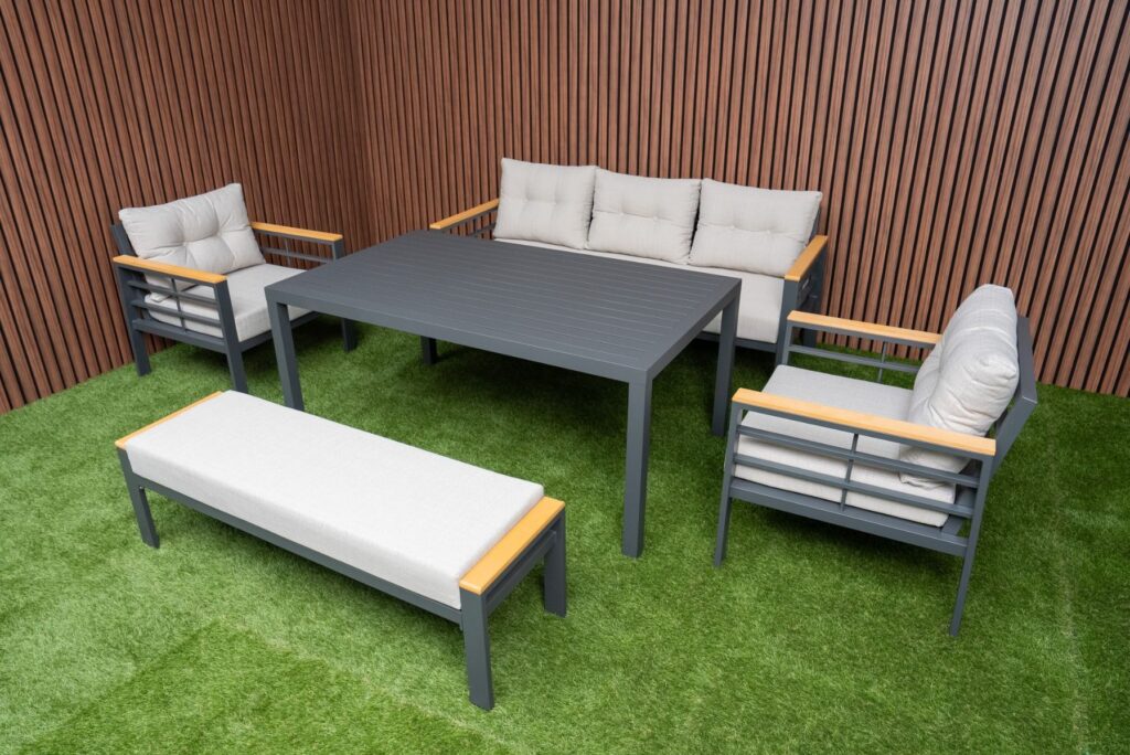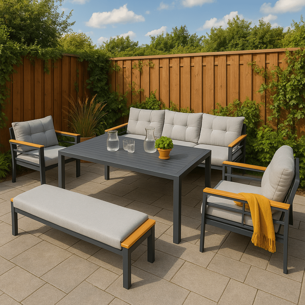 Suchen Sie ein komplettes Gartenset für gemütliche Abendessen im Freien? Das Garten-Essgruppe Blakes 7-Sitzer Gartenset Anthrazit Aluminium/Holz 06260A vereint modernes Design mit hohem Komfort. Dieses großzügige Set besteht aus einem 3-Sitzer-Sofa (180 × 75 × 74 cm), zwei Sesseln (75 × 75 × 74 cm), einer praktischen Bank (135 × 40 × 40 cm) sowie einem geräumigen Esstisch (150 × 90 × 67 cm). Zusammen bietet das Set Platz für mindestens sieben Personen – ideal für lange Sommerabende mit Familie und Freunden.