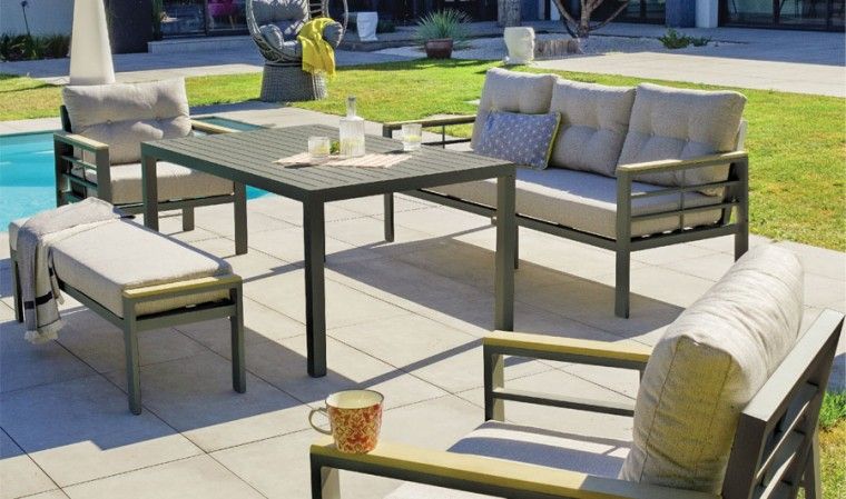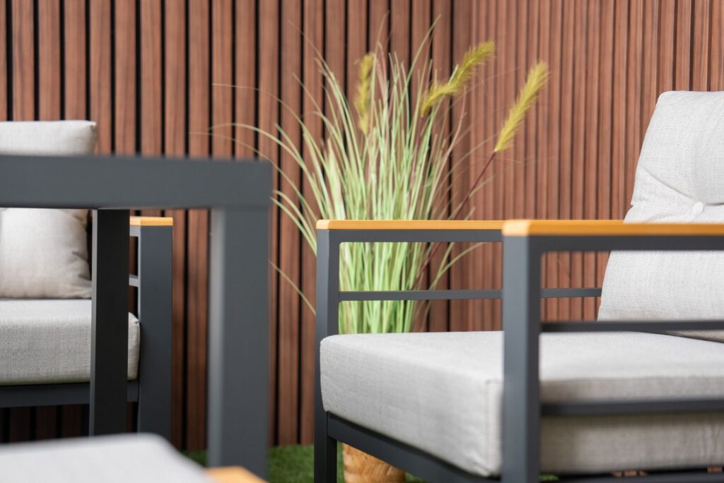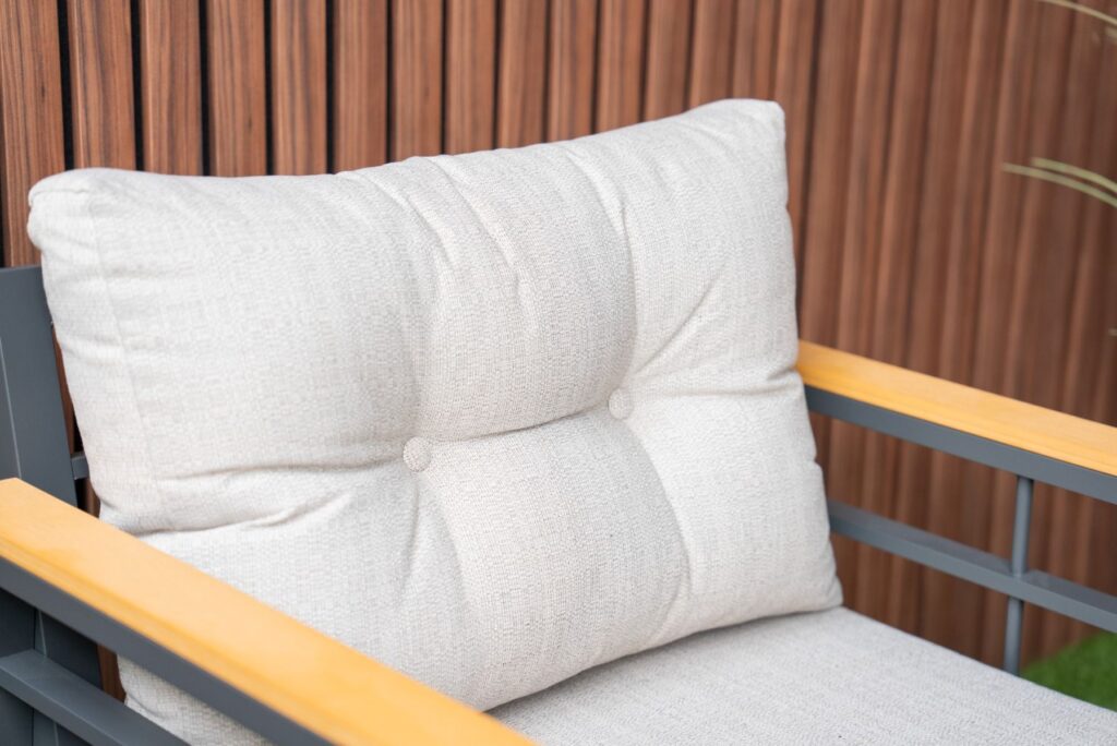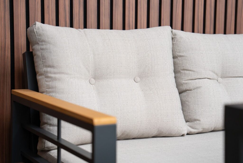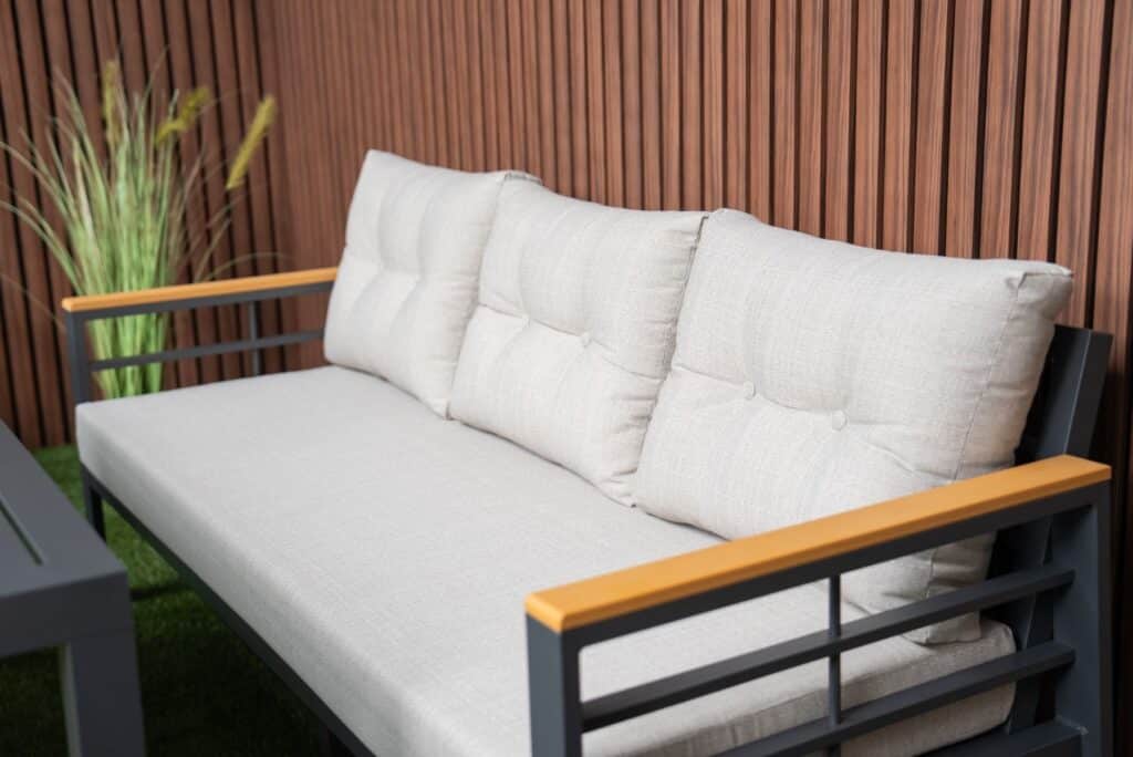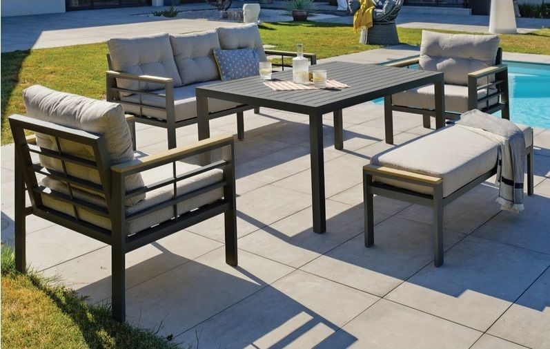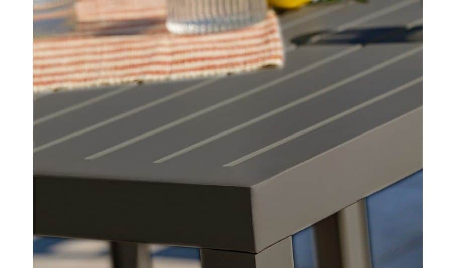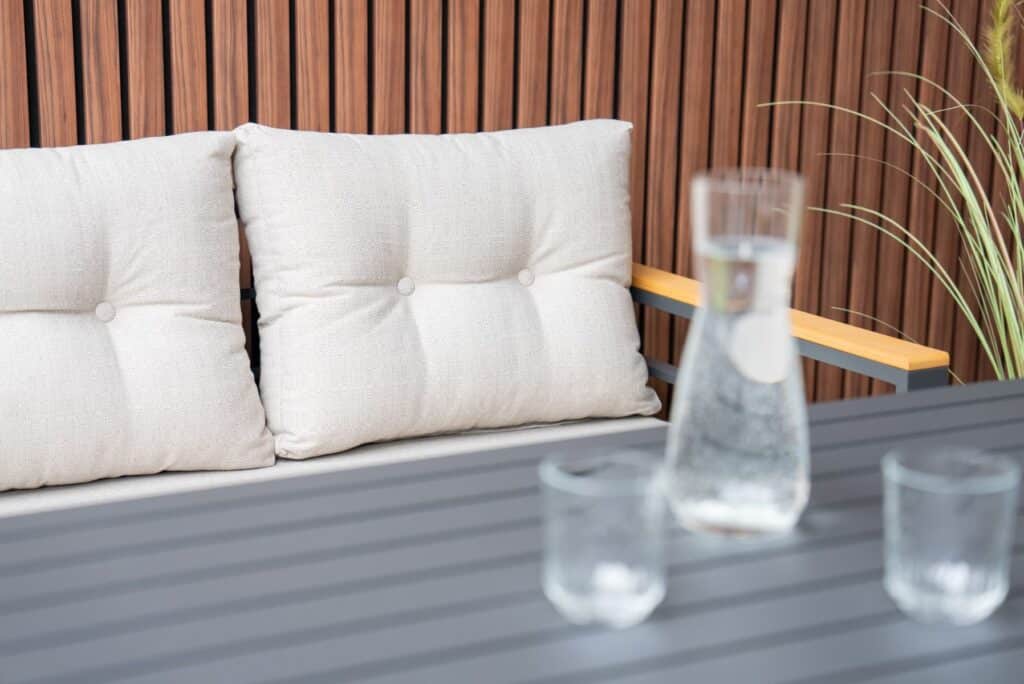 Die Farbe des Gestells ist 100 % identisch mit allen anderen Gartenmöbeln auf unserer Website in Anthrazit. Dadurch lässt sich dieses Dining-Set mühelos mit Loungesets, Sesseln und weiteren Gartenmöbeln kombinieren. Das Aluminium ist leicht, stabil und besonders pflegeleicht. Alle Materialien wurden speziell für den Einsatz im Freien ausgewählt, sodass das Set problemlos die gesamte Saison draußen stehen bleiben kann.