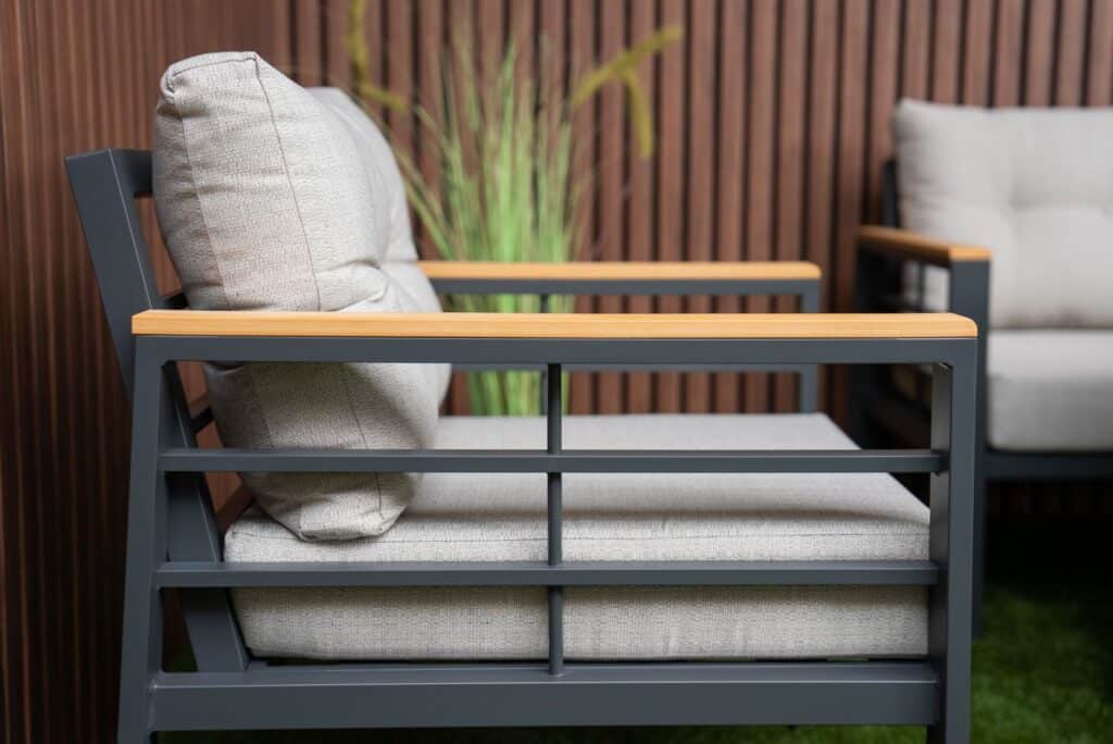 Das pulverbeschichtete Aluminiumgestell in Anthrazit harmoniert perfekt mit den warmen Polywood-Holzakzenten an den Armlehnen. Die extra dicken Sitzkissen mit 12 cm Stärke in Grau bestehen aus wasserabweisendem Polyester und sorgen für angenehmen Sitzkomfort. Mit einer Sitzhöhe von 43 cm sitzen Sie entspannt am Tisch. Die großzügigen Sitzflächen sind so bequem, dass Sie sowohl gemütlich dinieren als auch den ganzen Abend entspannt verweilen können.