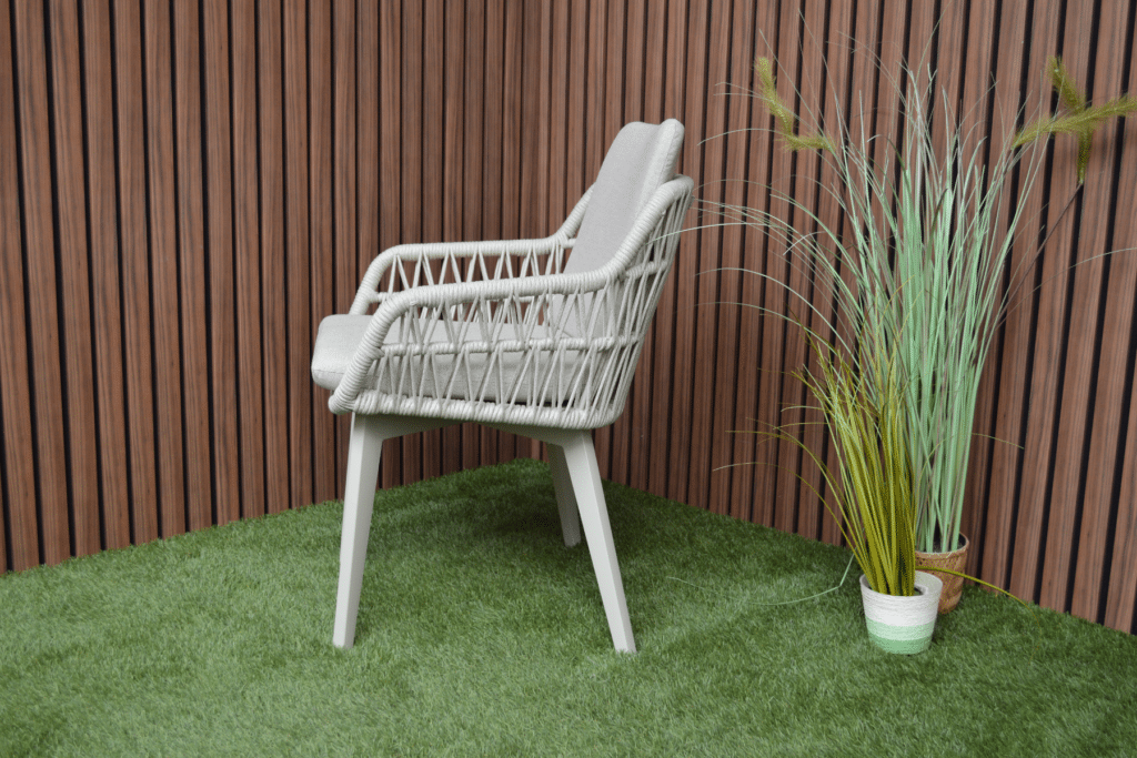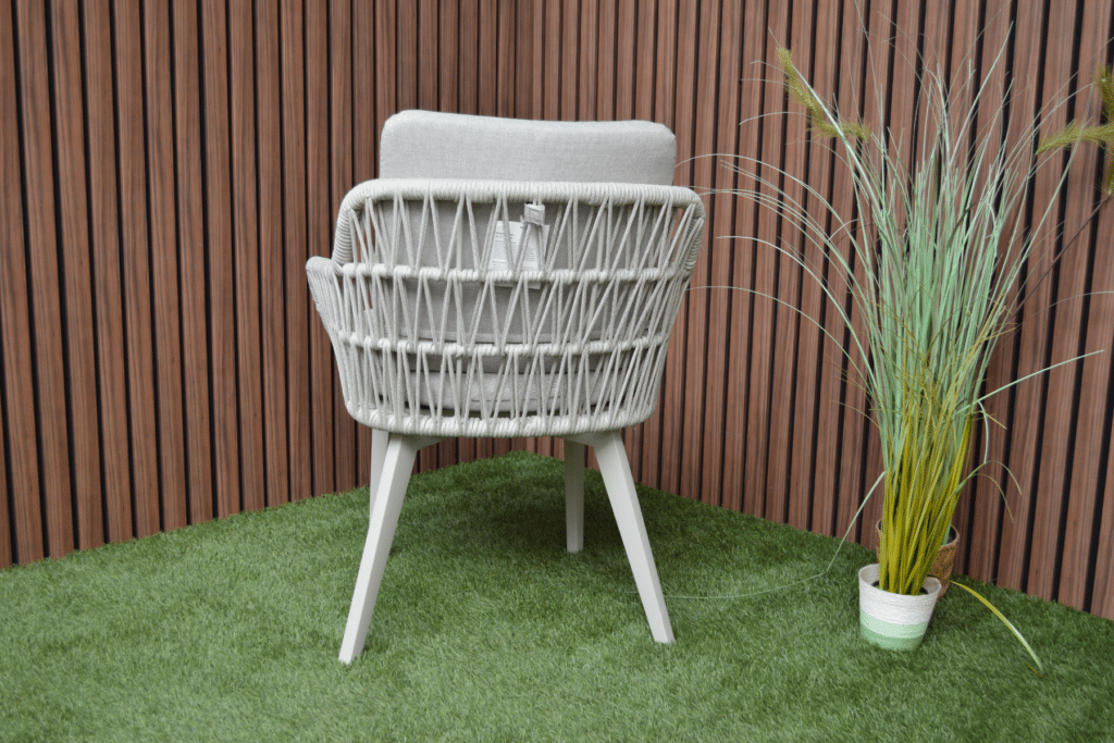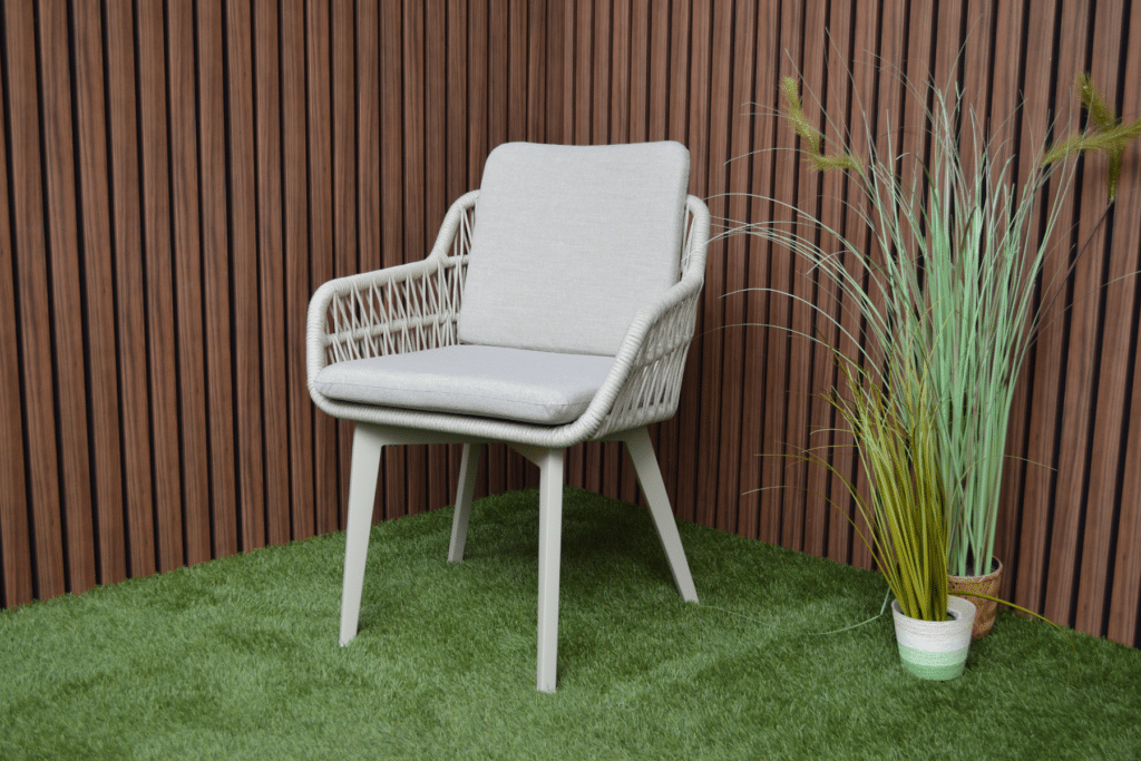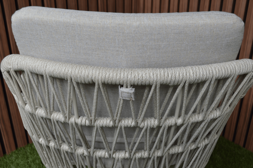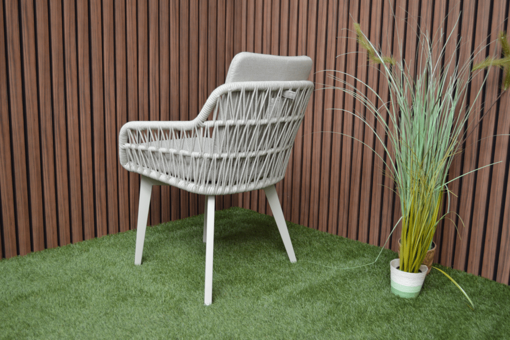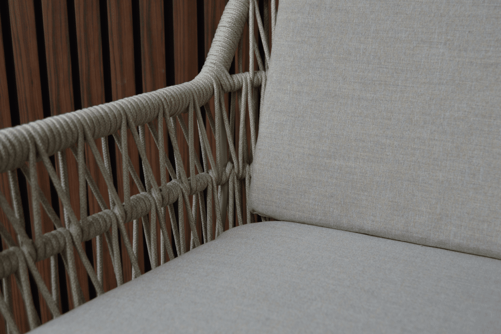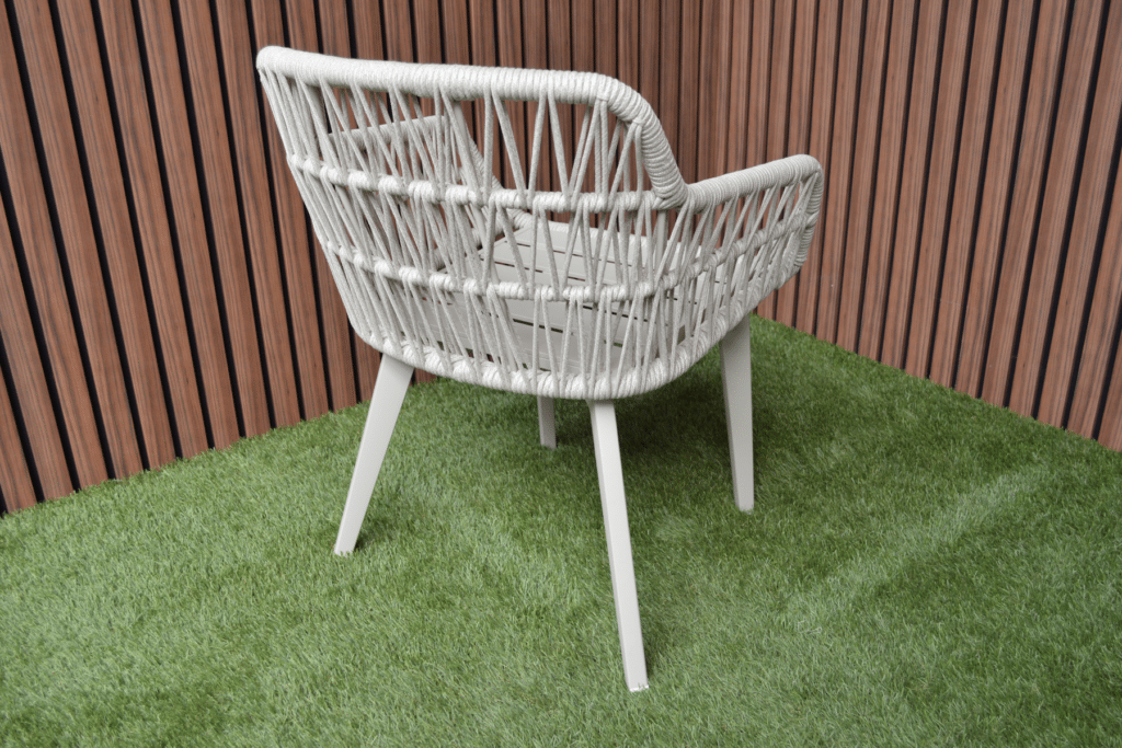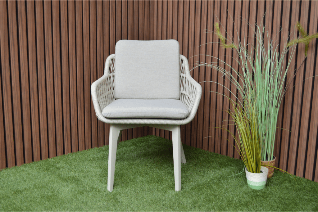 Mit den großzügigen Maßen von 63 x 61 x 78 cm und einer Sitzhöhe von 48 cm sitzt du bequem an jedem Gartentisch. Das 5 cm dicke Polyester-Sitz- und Rückenkissen sorgt für langanhaltenden Komfort bei Dinnern oder entspannten Momenten draußen. Die Armlehnen auf 62 cm Höhe bieten zusätzliche Unterstützung und erleichtern das Aufstehen. Das pulverbeschichtete Aluminiumgestell ist leicht, rostfrei und kann das ganze Jahr über draußen stehen bleiben. Das moderne Rope-Geflecht ist wetterbeständig, pflegeleicht und verblasst nicht schnell.