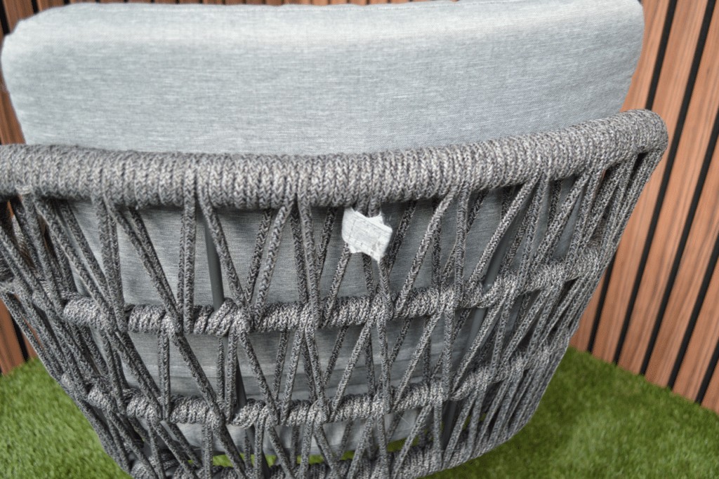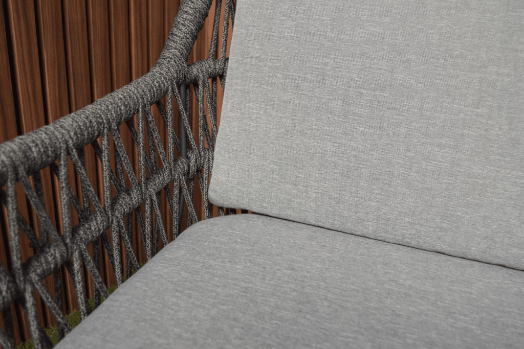 Das geflochtene Rope in der Rückenlehne sorgt für eine moderne Optik und verleiht dem Stuhl eine luxuriöse Ausstrahlung. Die großzügigen Maße von 63 x 61 x 81 cm und die Sitzhöhe von 48 cm sorgen dafür, dass du an jedem Gartentisch bequem sitzt. Das 5 cm dicke Polyester-Sitzkissen und das Rückenkissen in Grau bieten optimale Unterstützung. Die Armlehnen auf 63 cm Höhe machen das Hinsetzen und Aufstehen besonders leicht. Ideal, um stundenlang zu entspannen.