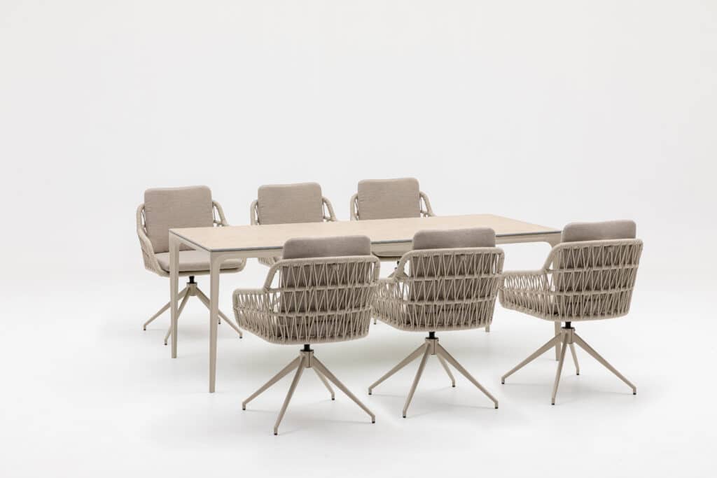 Die warmweiße Farbe des Gestells ist zu 100 % identisch mit allen anderen Gartenmöbeln in dieser Farbe auf unserer Website. Kombiniere den drehbaren Sevilla Gartensessel mühelos mit passenden Tischen, Loungesets und Sesseln. So stellst du dir ganz einfach dein ideales Gartenmöbel-Set zusammen, das perfekt harmoniert. Möchtest du diesen Sommer ultimativen Komfort in deinem Garten genießen? Bestelle den drehbaren Sevilla Gartensessel jetzt und erlebe, wie angenehm entspanntes Sitzen am Tisch sein kann.