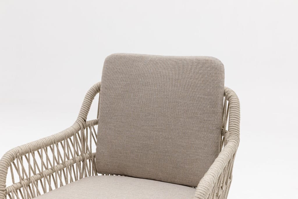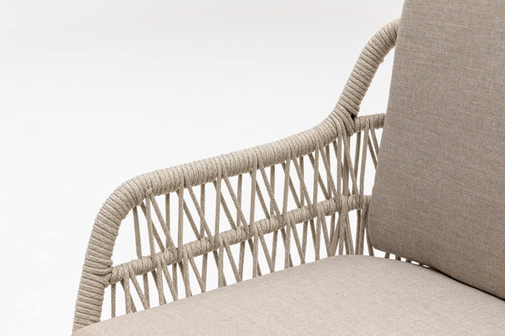 Mit den großzügigen Maßen von 63 x 61 x 81 cm und einer Sitzhöhe von 48 cm sitzt du bequem an jedem Gartentisch. Das 5 cm dicke Polyester-Sitzkissen und das komfortable Rückenkissen in warmem Taupe bieten optimale Unterstützung. Die Armlehnen auf 63cm Höhe machen das Hinsetzen und Aufstehen besonders leicht. Das pulverbeschichtete Aluminiumgestell in Warmweiß ist leicht, rostfrei und kann das ganze Jahr über draußen stehen bleiben. Das Rope-Geflecht ist wetterbeständig und verblasst nicht schnell.