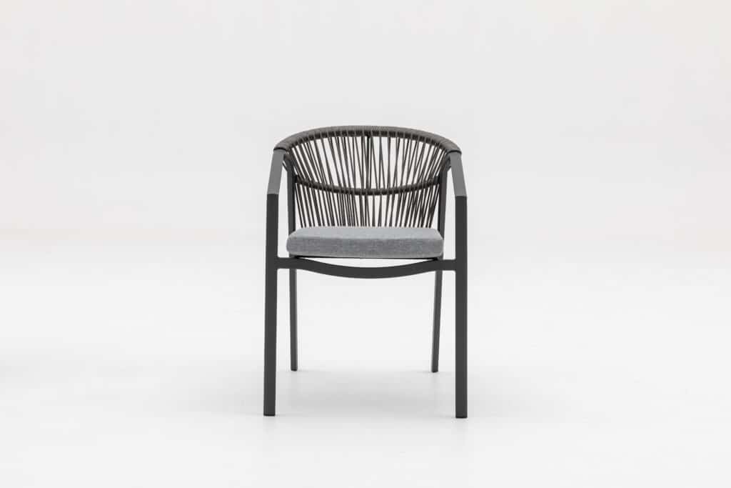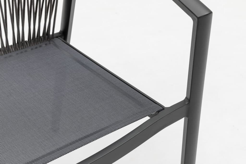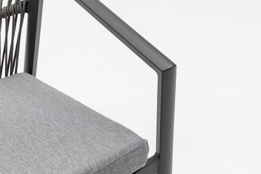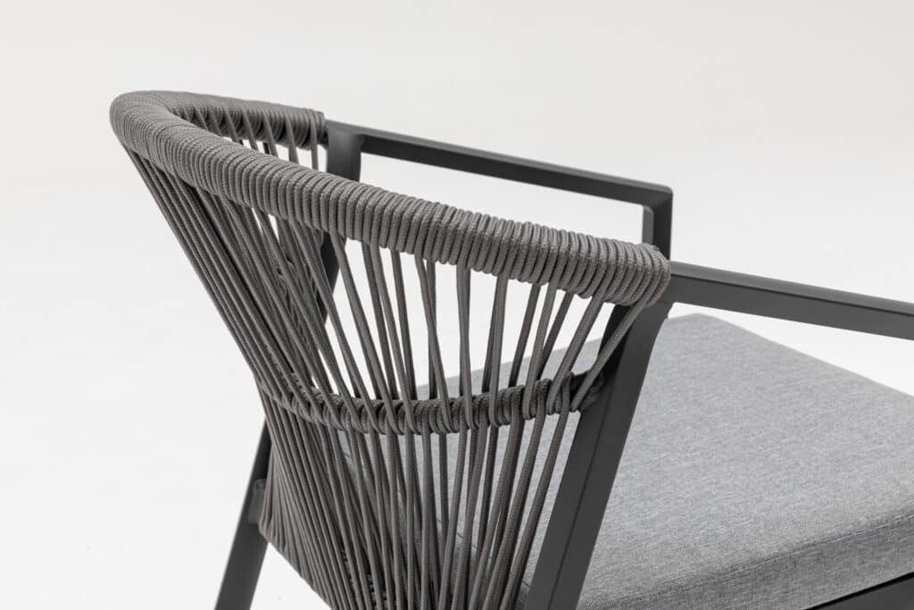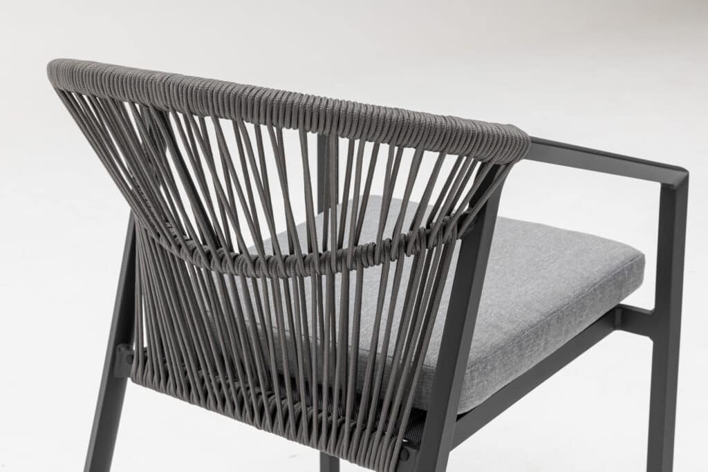 Das Aluminiumgestell besitzt eine starke Pulverbeschichtung in Anthrazit. Diese Schutzschicht sorgt dafür, dass der Stuhl jahrelang draußen stehen kann, ohne zu rosten oder zu verblassen. Auch das Rope-Geflecht ist wetterbeständig. Die anthrazitfarbene Farbe ist zu 100 % identisch mit allen anderen Gartenmöbeln in dieser Farbe auf unserer Website. Kombiniere den Valencia Gartenstuhl perfekt mit passenden Tischen, Loungesets und Sesseln.