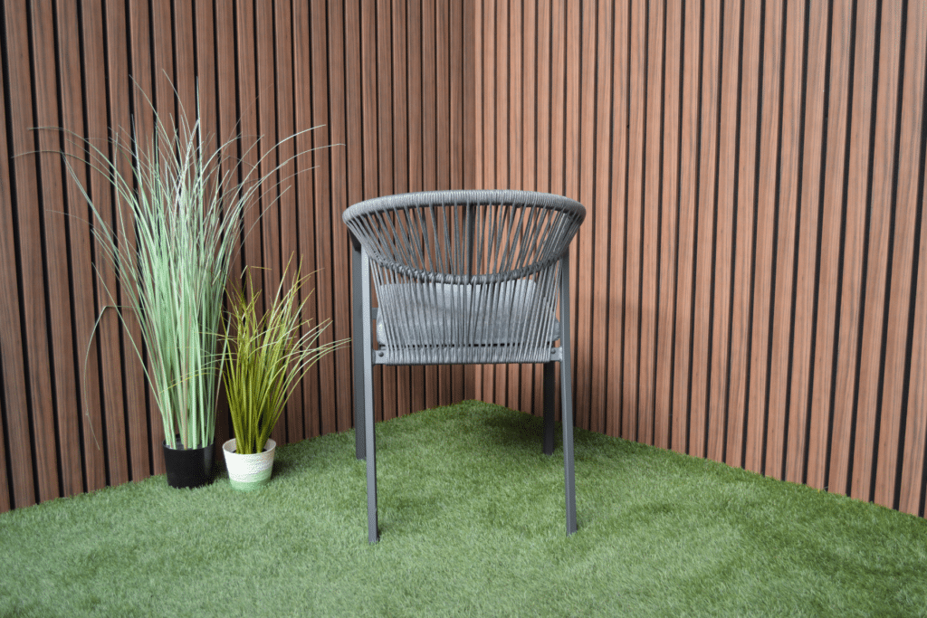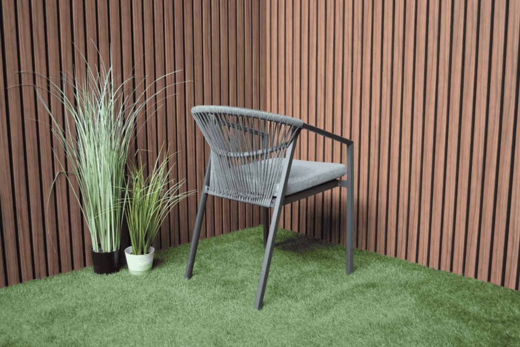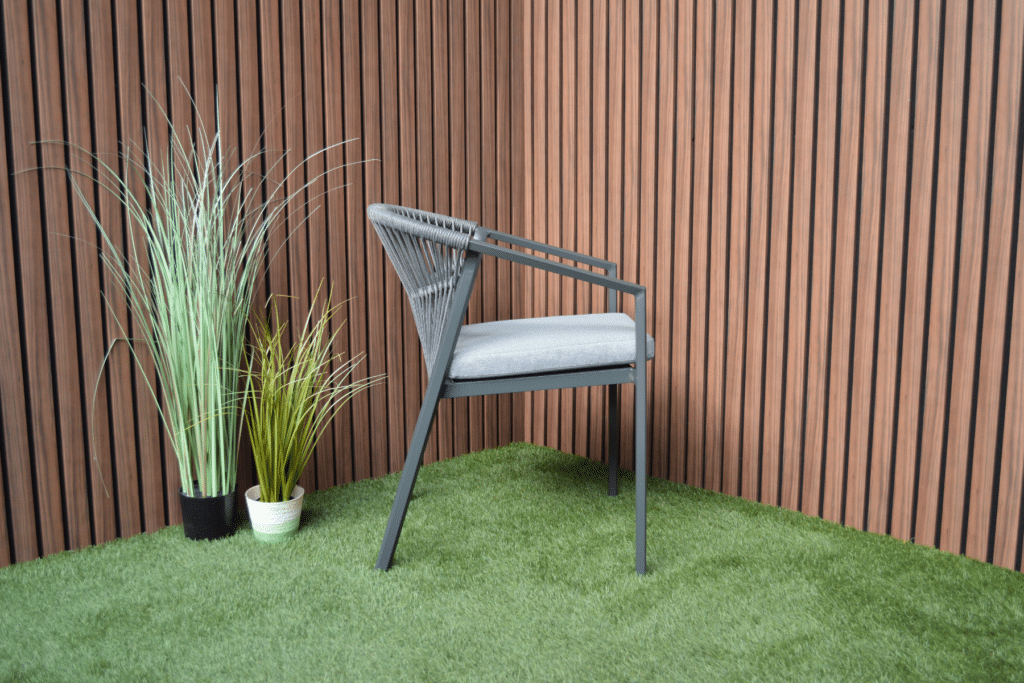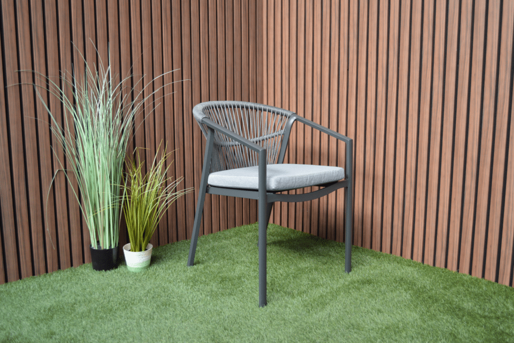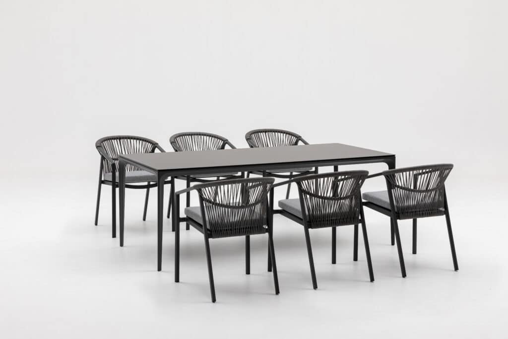 Das Aluminiumgestell besitzt eine starke Pulverbeschichtung in Anthrazit. Diese Schutzschicht sorgt dafür, dass der Stuhl jahrelang draußen stehen kann, ohne zu rosten oder zu verblassen. Auch das Rope-Geflecht ist wetterbeständig. Die anthrazitfarbene Farbe ist zu 100 % identisch mit allen anderen Gartenmöbeln in dieser Farbe auf unserer Website. Kombiniere den Valencia Gartenstuhl perfekt mit passenden Tischen, Loungesets und Sesseln.
