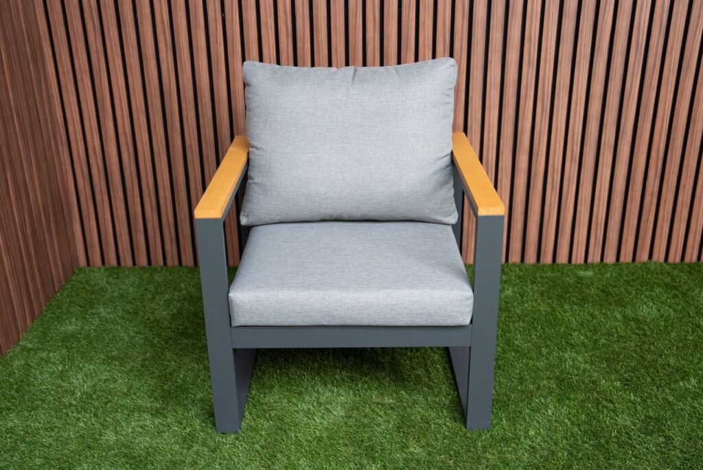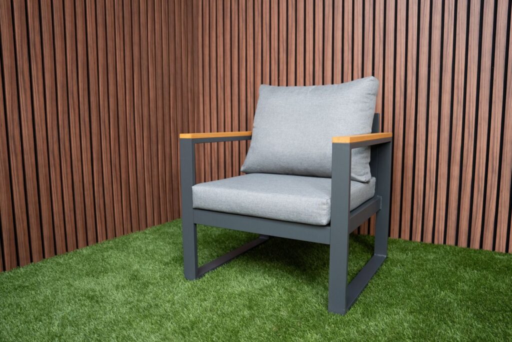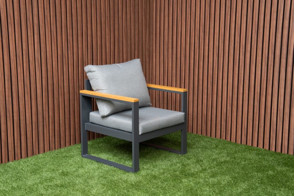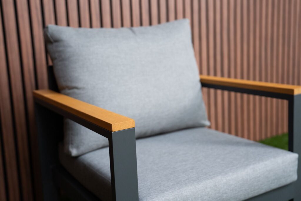 Das Gestell besteht aus hochwertigem, pulverbeschichtetem Aluminium in Anthrazit. Aluminium ist rostfrei, stabil und besonders pflegeleicht. Die stilvollen Armlehnen aus FSC-zertifiziertem Akazien-Hartholz mit einer Stärke von 18 mm verleihen dem Stuhl eine warme und luxuriöse Ausstrahlung. Mit einer Sitzhöhe von 42 cm sitzen Sie wunderbar entspannt. Die Reinigung ist einfach: Wasser und ein mildes Reinigungsmittel genügen. Die mitgelieferten grauen Kissen sind reichlich gefüllt und aus wasserabweisendem Polyester gefertigt. Sie sind schmutzabweisend und feuchtigkeitsresistent – ideal für den Außenbereich. Ein Missgeschick? Flüssigkeiten lassen sich ganz einfach abwischen.