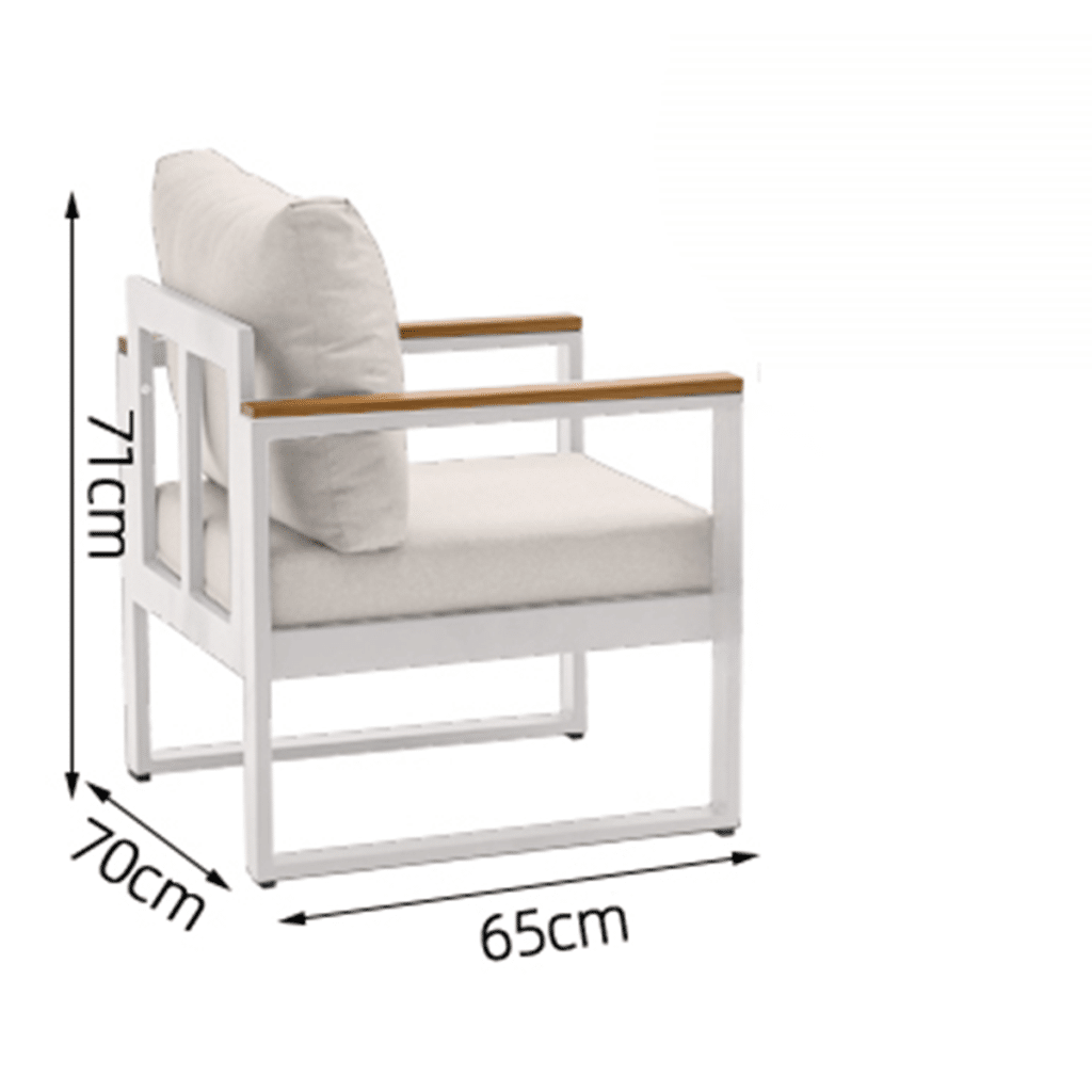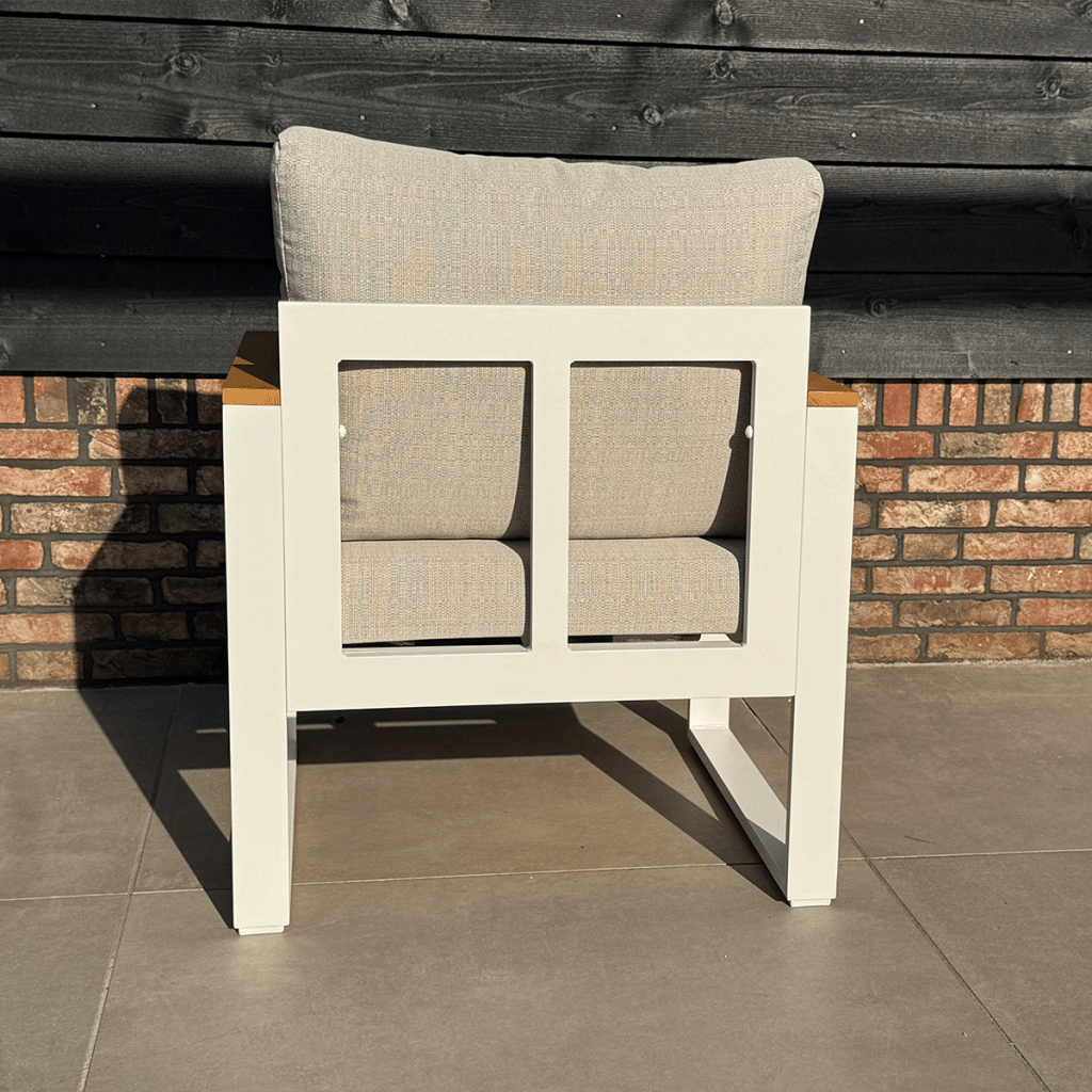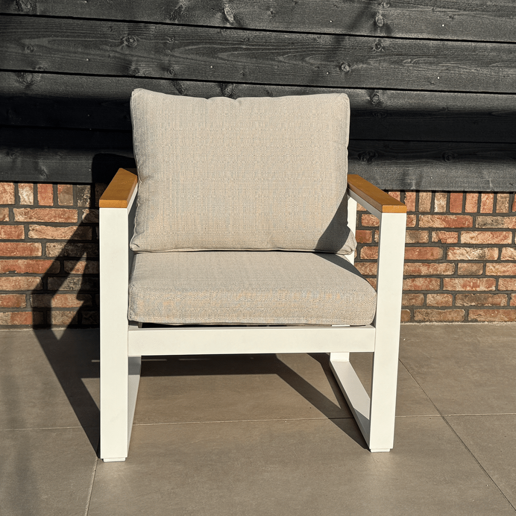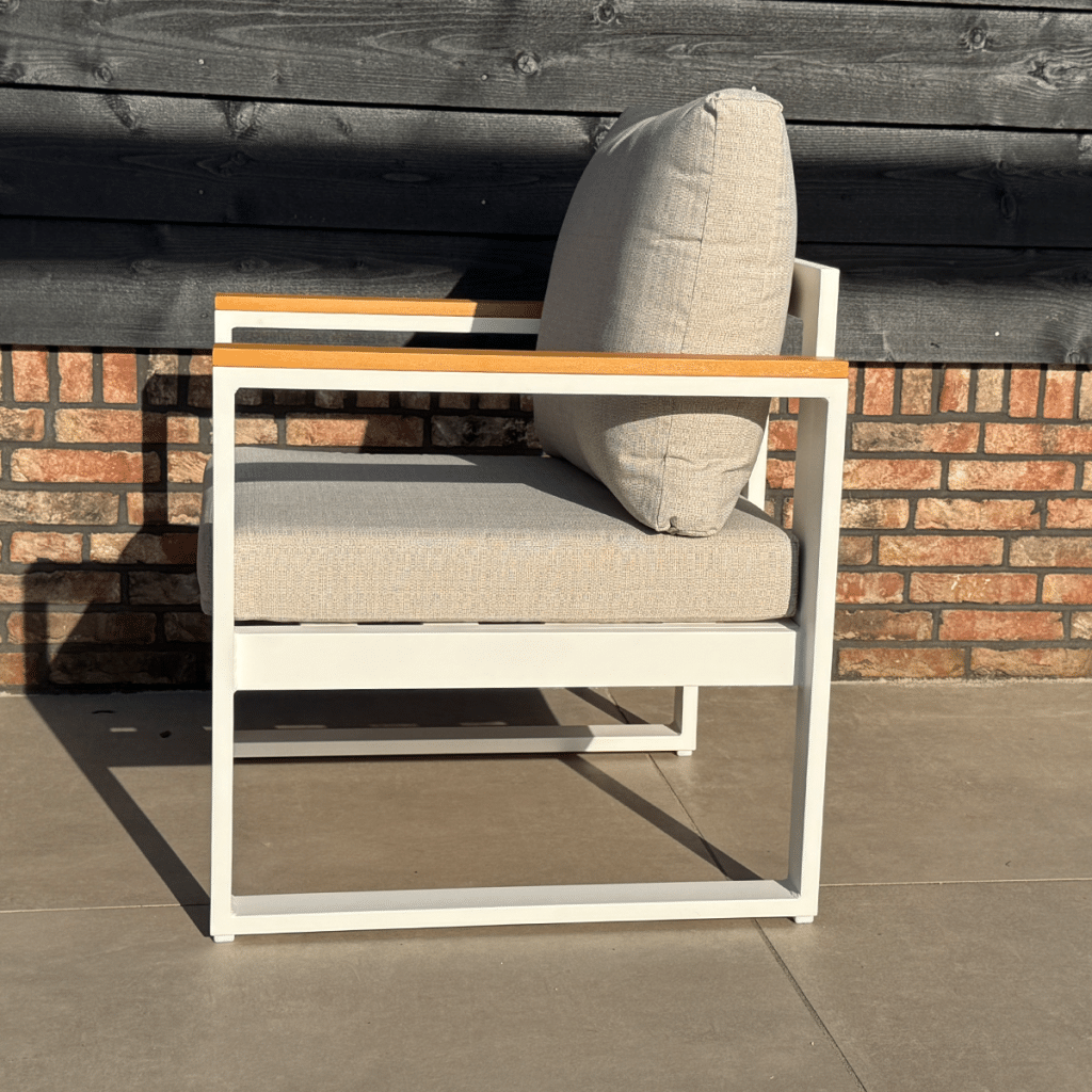 Suchst du einen modernen und komfortablen Gartensessel? Der Loungesessel Cube Weiß Diningchair Aluminium/Holz 22381W ist perfekt für luxuriöse Entspannungsmomente in deinem Garten oder auf deiner Terrasse. Dieser großzügige Stuhl aus der Cube-Kollektion ist 70 cm breit, 65 cm tief und 71 cm hoch. Die herrlich dicken Sitz- und Rückenkissen von 10 cm verwöhnen dich spürbar und sorgen für ausgezeichneten Sitzkomfort. Die Kombination aus dem mattweißen Gestell und den warmen FSC-Akazienholz-Armlehnen verleiht dem Stuhl eine stilvolle und luxuriöse Ausstrahlung.