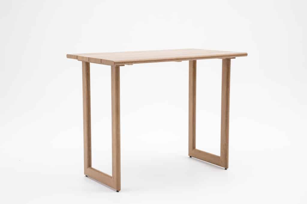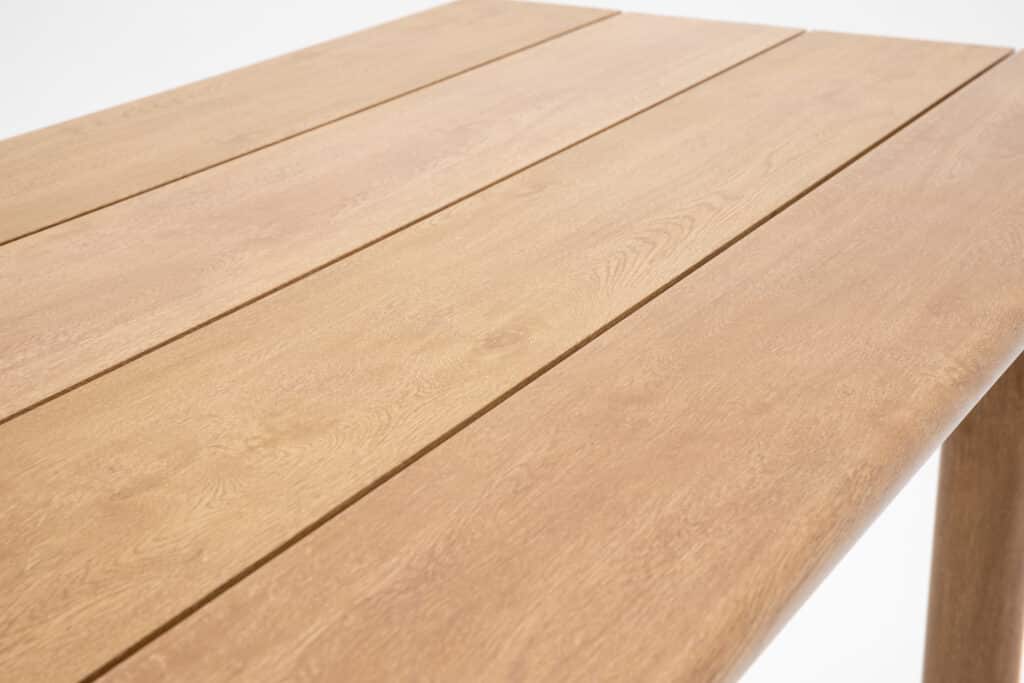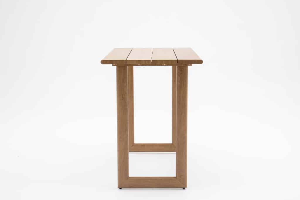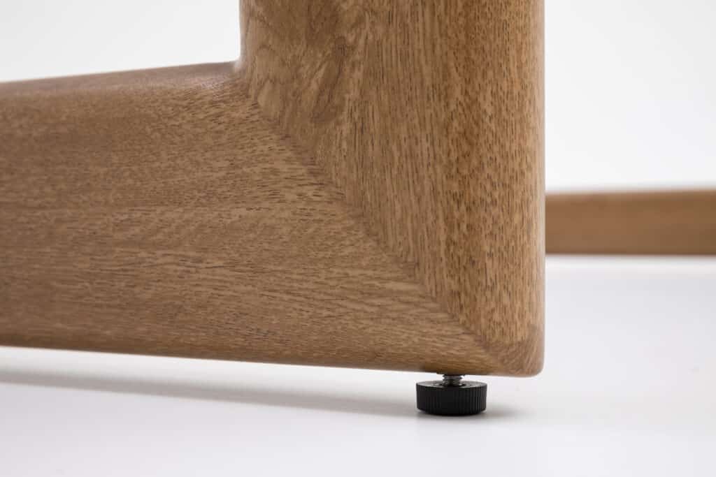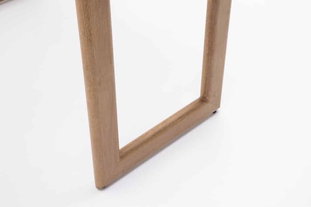 Das Gestell besteht aus pulverbeschichtetem Aluminium. Dieses Material ist leicht, rostfrei und widerstandsfähig gegen alle Witterungseinflüsse. Die natürliche Holzoptik sorgt für eine warme Ausstrahlung – ganz ohne den Pflegeaufwand von echtem Holz. Besonders praktisch: Die Beine sind mit verstellbaren Füßen ausgestattet. Damit kannst du den Bartisch auch auf unebenem Untergrund perfekt ausrichten. Die Tischbeine werden separat geliefert und lassen sich einfach selbst montieren.