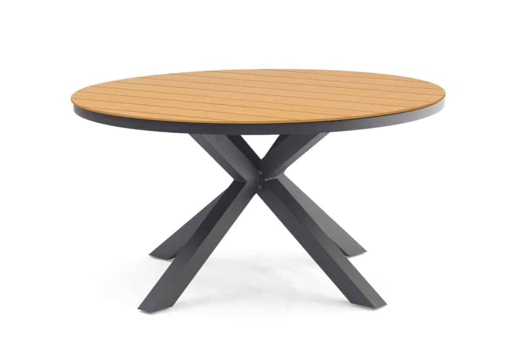 Der runde Gartentisch Calgary 140 cm Anthrazit/Holz ist der perfekte Mittelpunkt für gemütliche Momente im Freien. Mit einem Durchmesser von 140 cm bietet dieser Tisch ausreichend Platz für mindestens 6 Personen. Die warme Tischplatte in Holzoptik in Kombination mit dem eleganten anthrazitfarbenen Gestell sorgt für eine moderne Ausstrahlung. Mit einer Höhe von 75 cm sitzt jeder bequem am Tisch. Der große Vorteil eines runden Esstisches? Jeder kann sich ansehen, wodurch Gespräche automatisch geselliger werden. Niemand sitzt am Kopfende, was die Atmosphäre entspannt und einladend macht. Ohne Ecken kannst du außerdem leicht um den Tisch herumgehen – praktisch, wenn du Gäste bedienen möchtest.