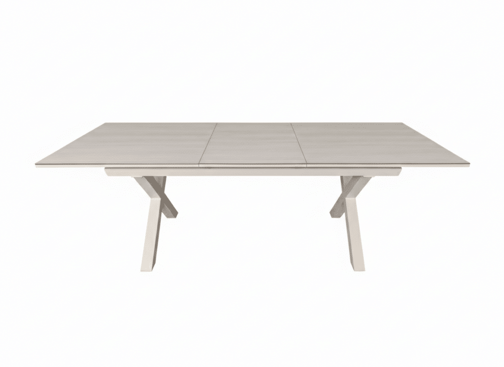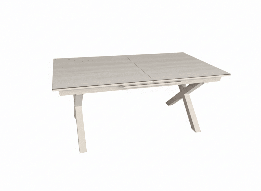 Das Gestell besteht aus pulverbeschichtetem Aluminium in einem warmweißen Farbton. Dieses Material ist leicht, rostfrei und kann das ganze Jahr über draußen stehen bleiben. Die Tischplatte aus Keramikglas wirkt modern und ist kratzfest. Reinigen? Ein feuchtes Tuch genügt. Die robusten X-Beine sorgen für zusätzliche Stabilität und einen klaren Look. Dank der verstellbaren Füße steht der Gartentisch immer waagerecht – auch auf unebenem Untergrund.