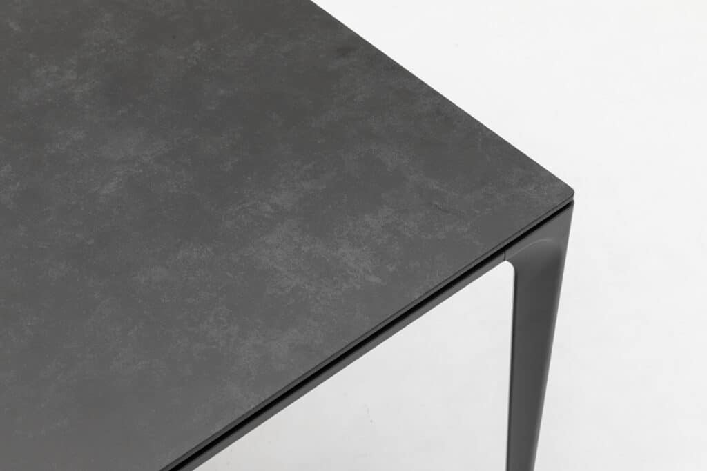 Dieser Dining-Gartentisch hat eine Höhe von 74 cm und eine freie Beinfreiheit von 68 cm. So sitzt du immer bequem – auch mit einem Lounge-Stuhl. Das Aluminiumgestell verfügt über eine starke Pulverbeschichtung in Anthrazit. Diese Schutzschicht rostet nicht und verblasst nicht. Die Tischplatte besteht aus Keramik: ein robustes Material, das kratzfest und leicht zu reinigen ist. Die verstellbaren Füße sorgen dafür, dass der Esstisch immer stabil steht, auch auf unebenem Untergrund.
