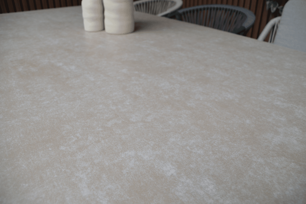 Das Aluminiumgestell besitzt eine matte warmweiße/beige Pulverbeschichtung. Diese starke Schutzschicht rostet nicht und verblasst nicht. Dadurch kann der Gartentisch das ganze Jahr über draußen stehen bleiben. Die Tischplatte in warmem Taupe/Beige besteht aus Keramik: ein robustes Material, das kratzfest und leicht zu reinigen ist. Mit einer Höhe von 74 cm sitzt du immer bequem. Die verstellbaren Füße sorgen für einen stabilen Stand auf jeder Terrasse.