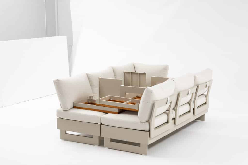 Die Premium Emerald II Warm Weiß muss mit beiden Bänken vollständig aneinander gestellt werden, Gesamtmaß: 225 × 165 x 78 cm.
