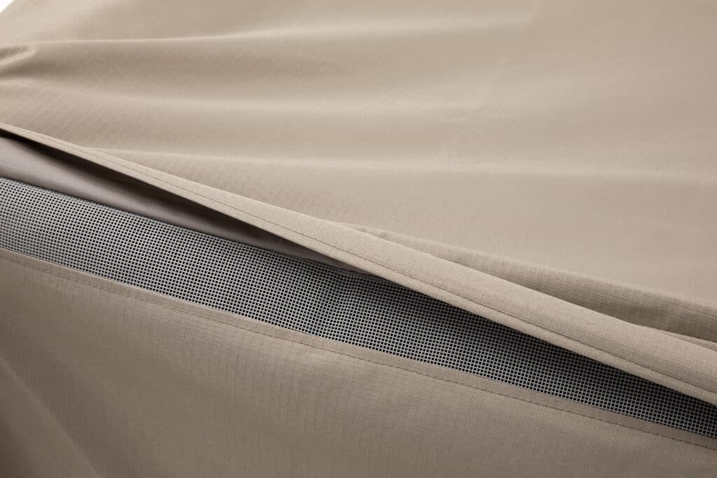 Schutzhülle für Gartenmöbel-Loungesets, u. a. geeignet für das beliebte Santiago-Loungeset von SenS-Line. Regenhülle aus robustem 600D-Polyester, graues Oxford-Gewebe mit PE/PVC-Beschichtung. Rundum mit Kordelzug und Befestigungsbändern ausgestattet, sodass die Hülle straff um das Gartenmöbelset gespannt werden kann. Mit Belüftungsöffnungen versehen. Diese passende Gartenmöbel-Schutzhülle wird in einer Aufbewahrungstasche geliefert, sodass sie praktisch verstaut werden kann. Die Gesamtmaße dieser hochwertigen Regenhülle betragen 190×170 cm.